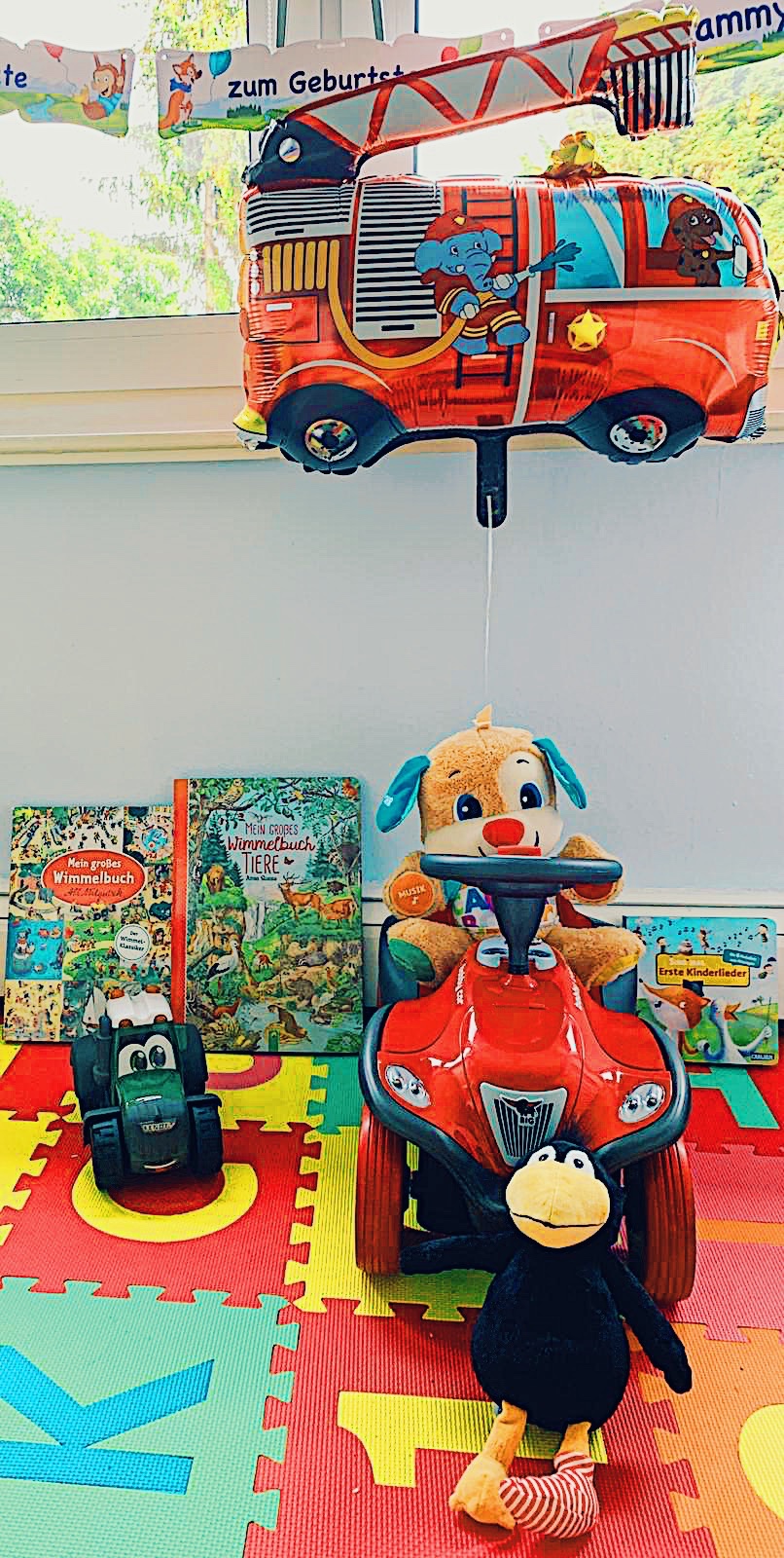 Das große Highlight war natürlich das Bobby Car. Mit Hupe, Anlasser-Sound und Licht! Den obligatorischen Luftballon in Silber oder Gold in Form einer 1 haben wir uns gespart. Dafür gab's einen mit ner Feuerwehr. Er versteht es vermutlich noch nicht und freut sich einfach über den Ballon.