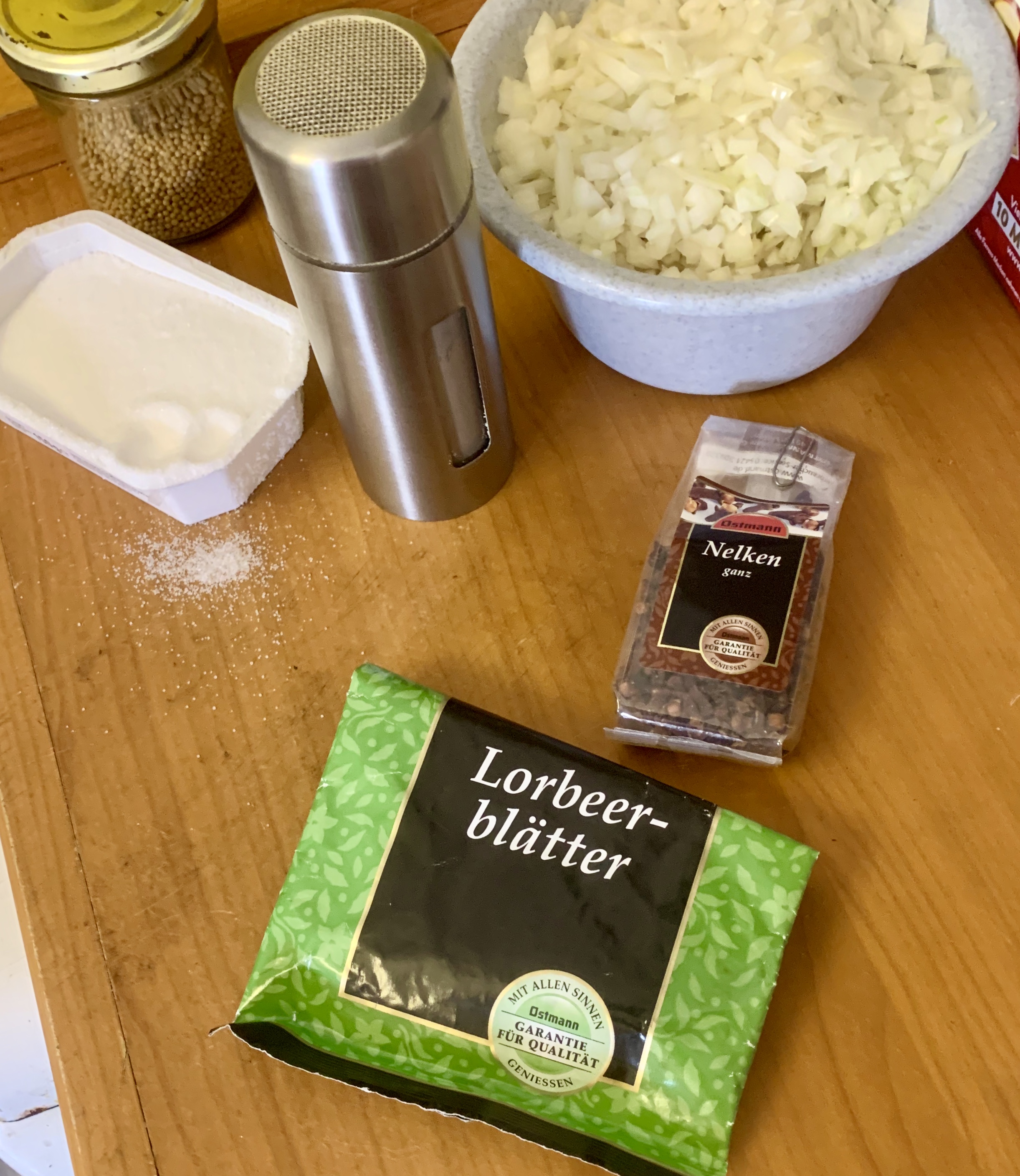 Würzen mit Peffer, Salz, Lorbeerblätter, Nelken, Sellerie, Zwiebeln, Lauch,Senfkörner, Knoblauch, Maggi und Möhren