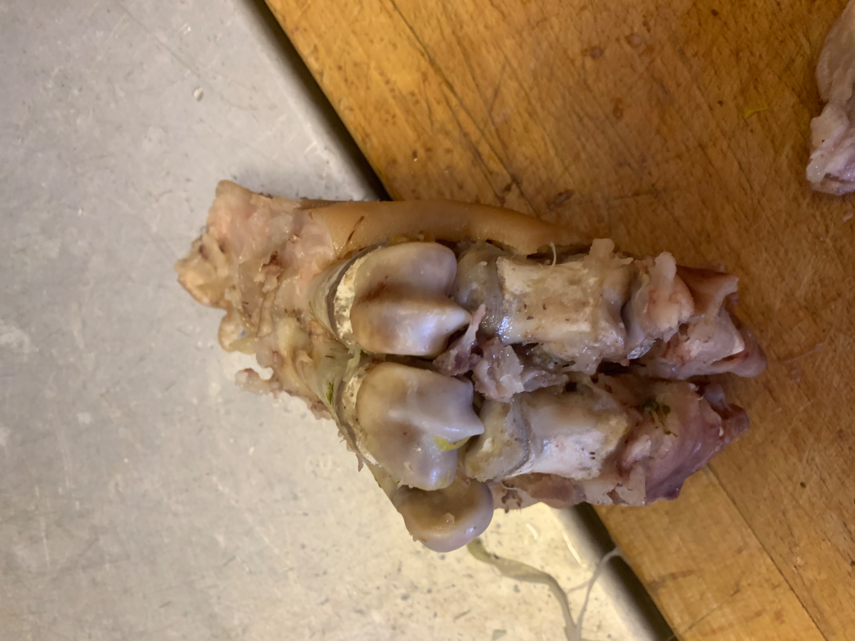 Wir holen immer Vorderfüße, der Vorteil weniger Knochen was ja gebraucht wird um die Sülze steif zu bekommen ist ja im Unterfuße Bänder und Sennen
