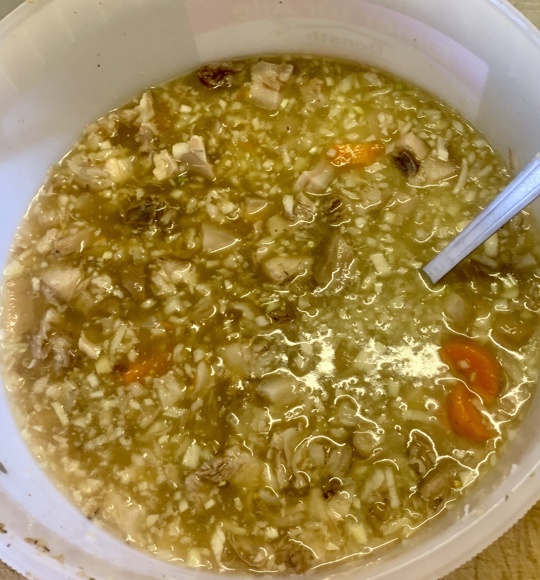Nach dem kleinschneiden das ganze in einem Eimer geben Kochtopf sauber machen und anschließend alles mit der Brühe die vorher abgeschöpft wurde in den Kochautomat geben
