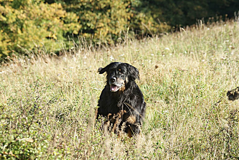 Erstmal hab ich ihm alles ausgezogen, hab ihn auf eine Wiese gefahren und hab ihn erstmal laufen lassen. Mein damaliger Hovawart sah ihn an - wedelte - und es entstand eine Freundschaft fürs Leben zwischen den Beiden. Von da an waren sie unzertrennlich.