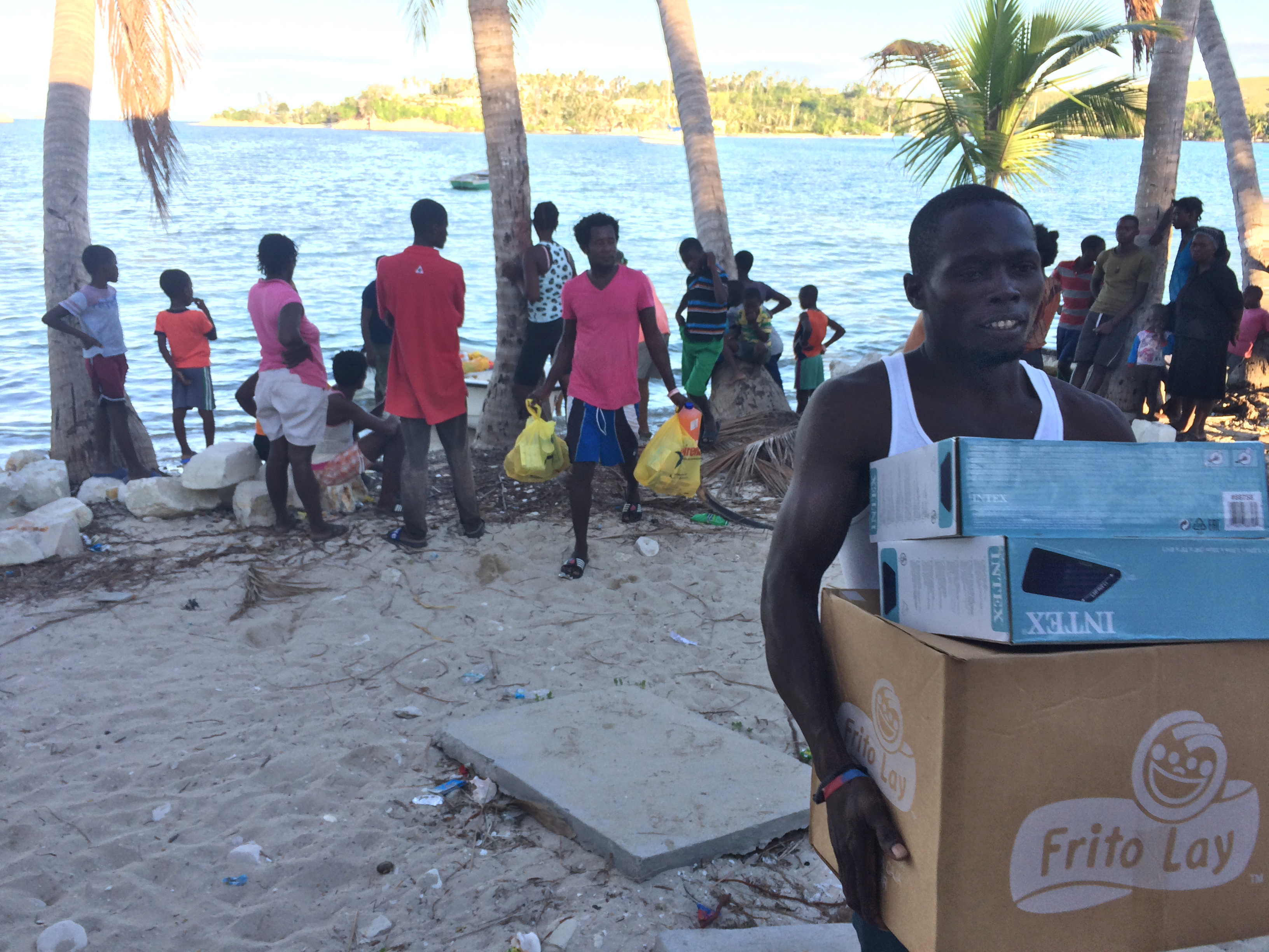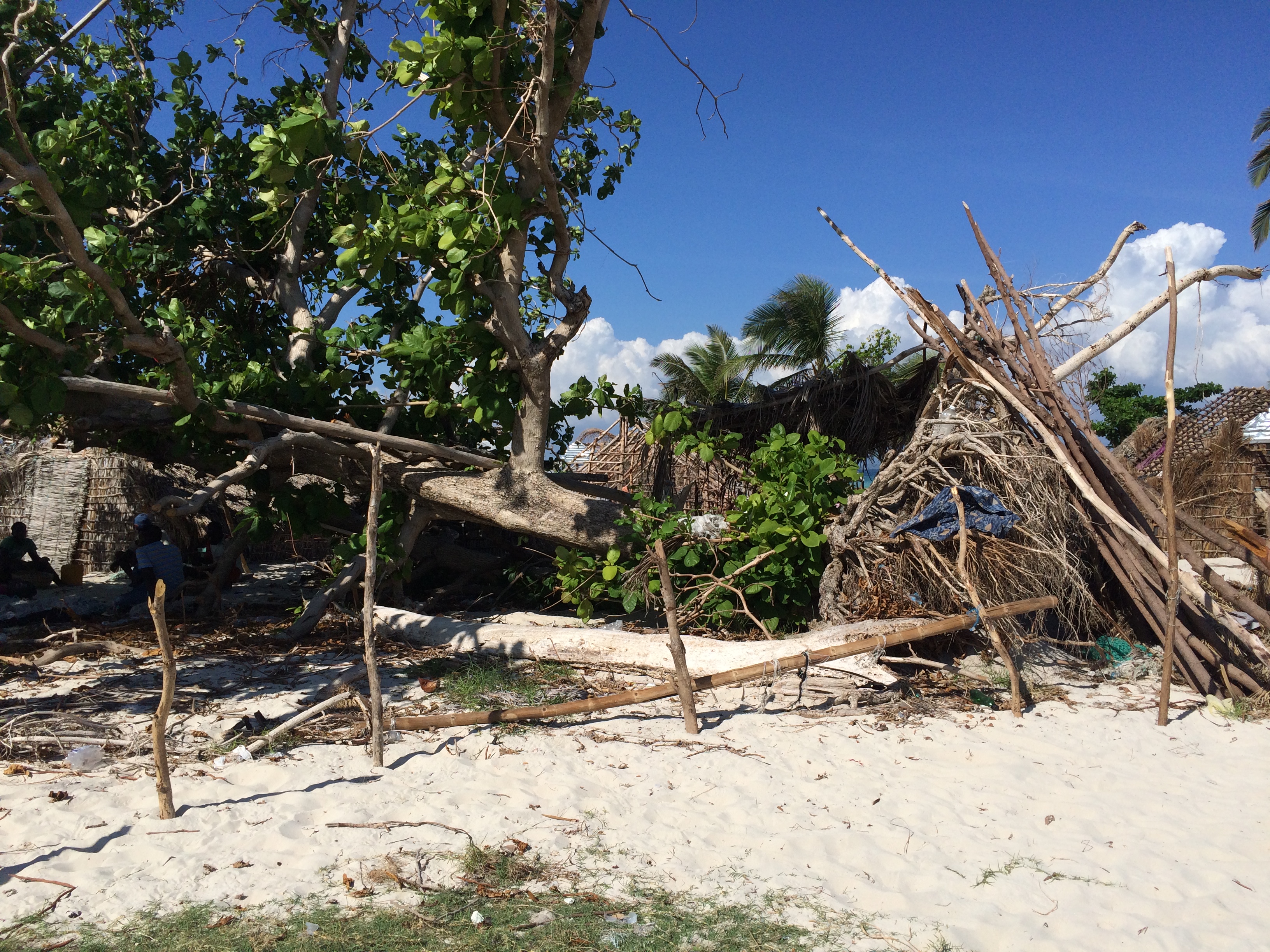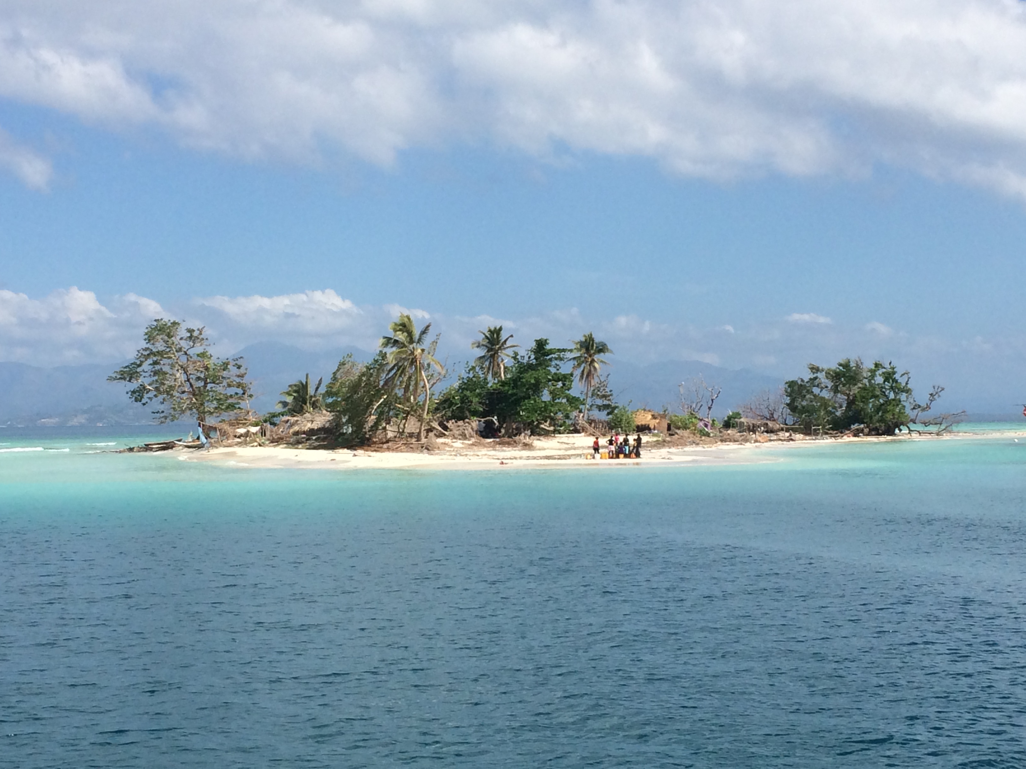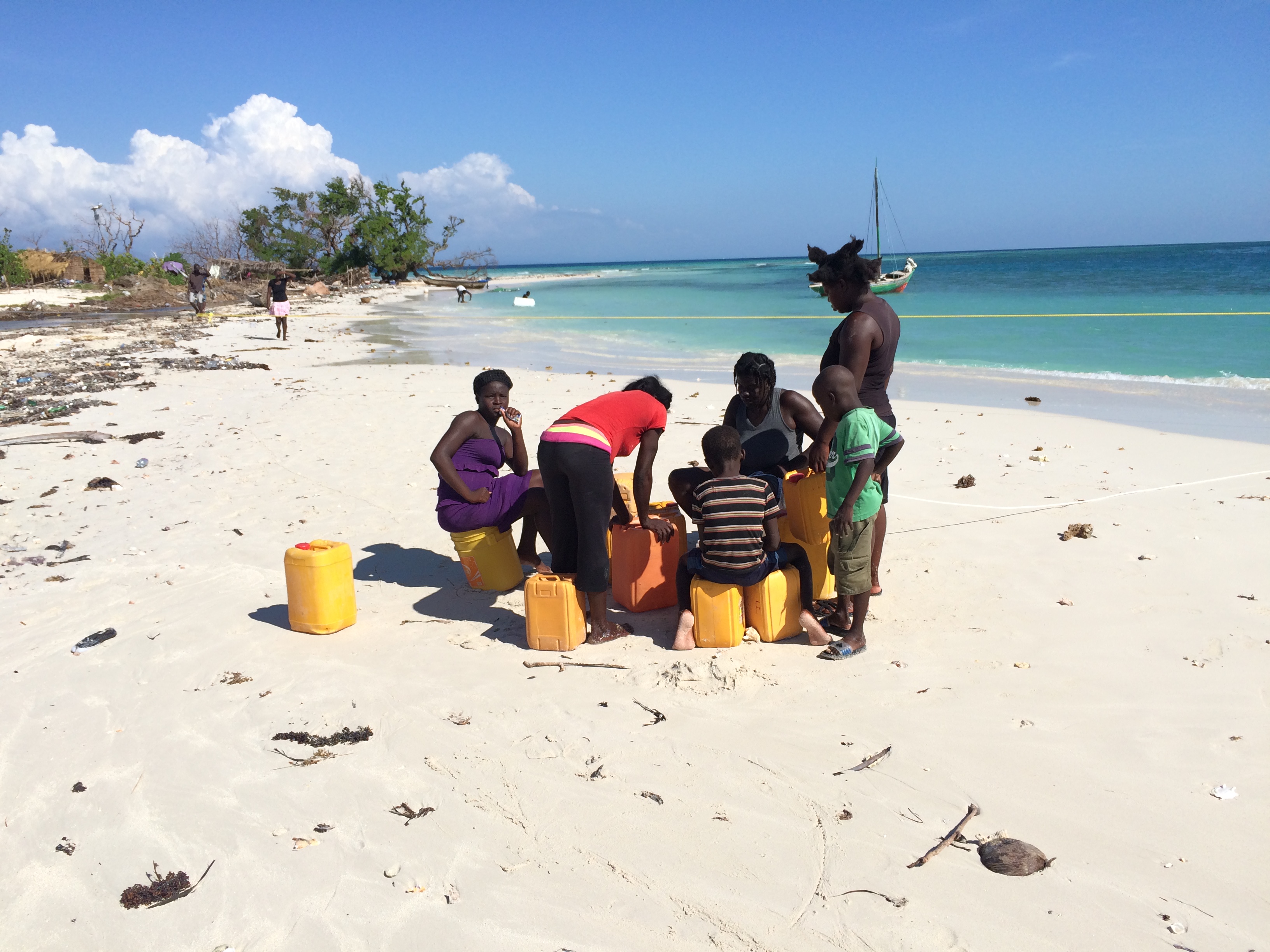 Wir hatten auf Bamba Maru kistenweise Verbandsmaterial, Antibiotika, Hygienepackungen, Überlebens- und Babynahrung Sets dabei und beschlossen mit dem Schiff direkt nach Madame Bernard zu segeln um den Medizinischen Teil der Ladung und den angehenden Arzt gleich beim Hospital abzuladen. Anschließend segelten wir zusammen mit der Tandemeer weiter zu den abgelegenen Inseln zwischen dem Festland und der Ile a Vache. Als wir in Sichtweite der Insel Ile Permantois kamen, liefen die Menschen bereits mit Kanistern und Flaschen an den Strand. Sie winkten uns aufgeregt zu und riefen "aqua-aqua". Wir warfen den Anker und holten ihre Behälter mit dem Beiboot ab. An Bord pumpten wir unsere beiden Wassertanks in ihre Kanister und brachten den Leuten Planen, Werkzeuge und Nahrungsmittel. Die Insel war kaum grösser als ein Fußballfeld, aber es lebten bis zu 70 Menschen dort. Ein massiver Mangobaum war umgestürzt und sein Wurzelwerk wurde notdürftig mit Stöcken und Planen abgedeckt. Da drin wohnte nun eine sechsköpfige Familie. Wie sie es geschafft hatten diesen Sturm zu überleben war mir ein Rätsel.