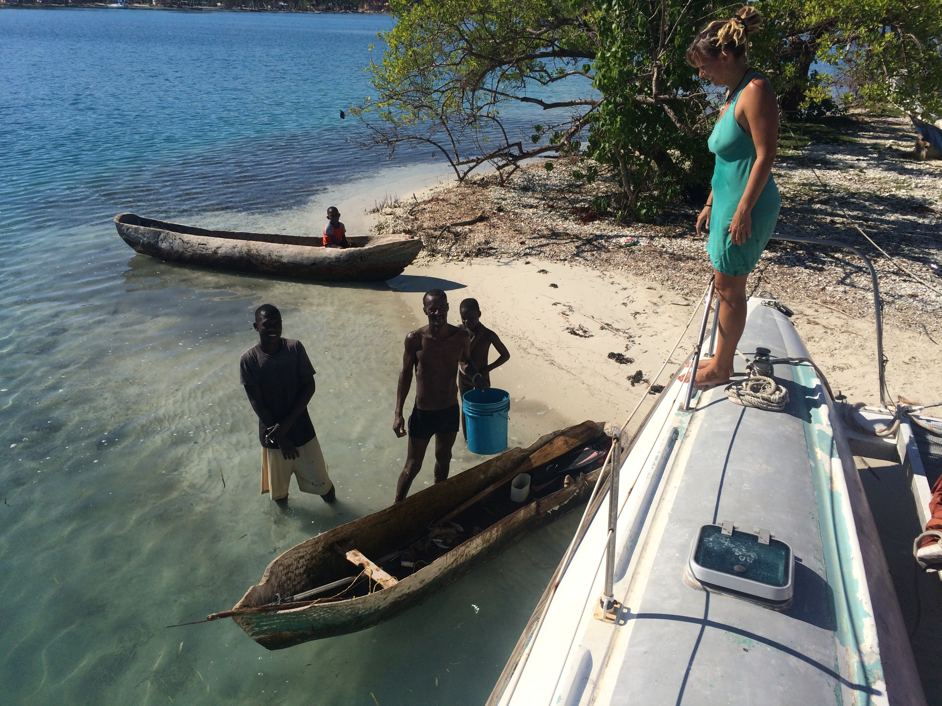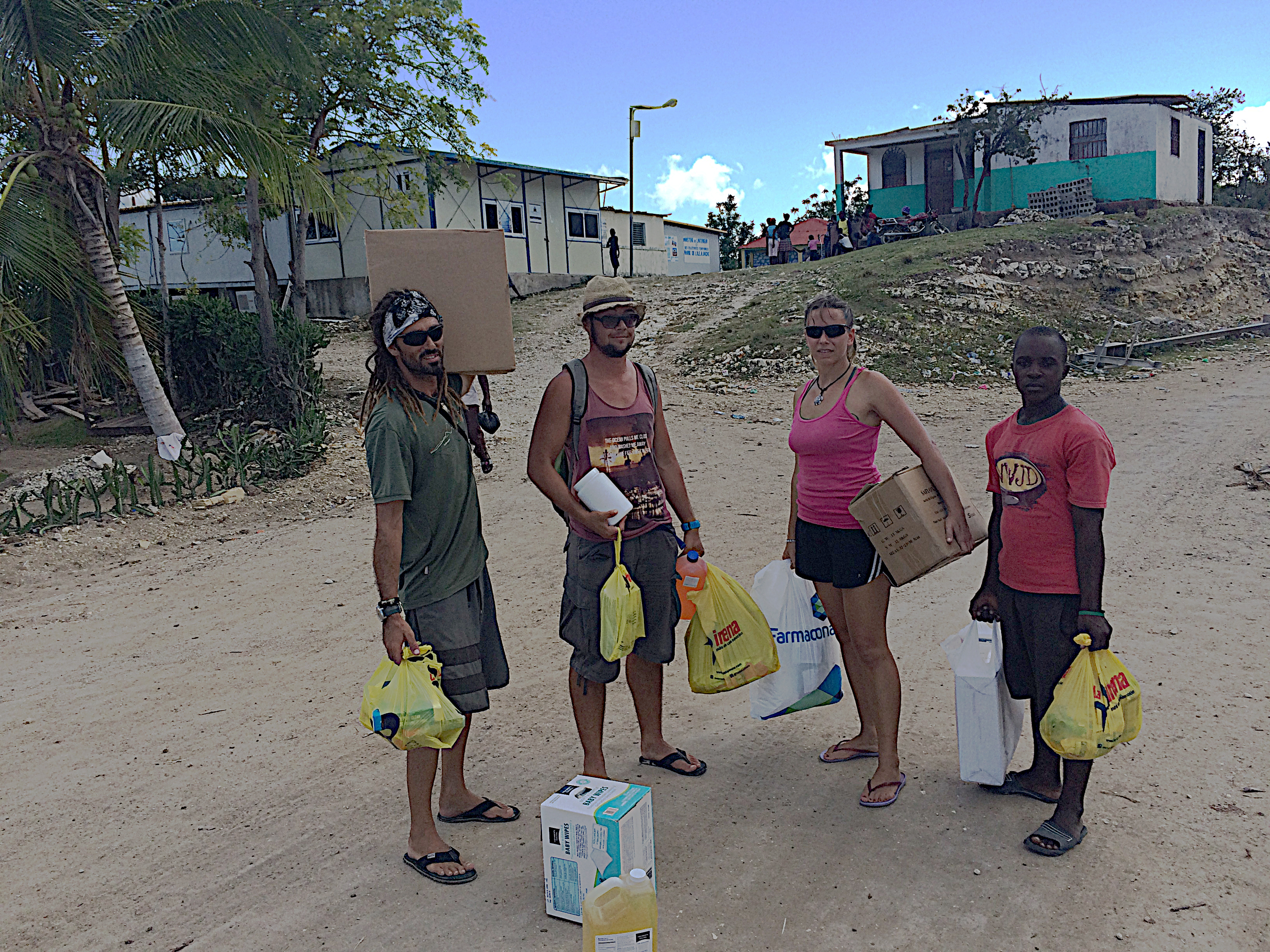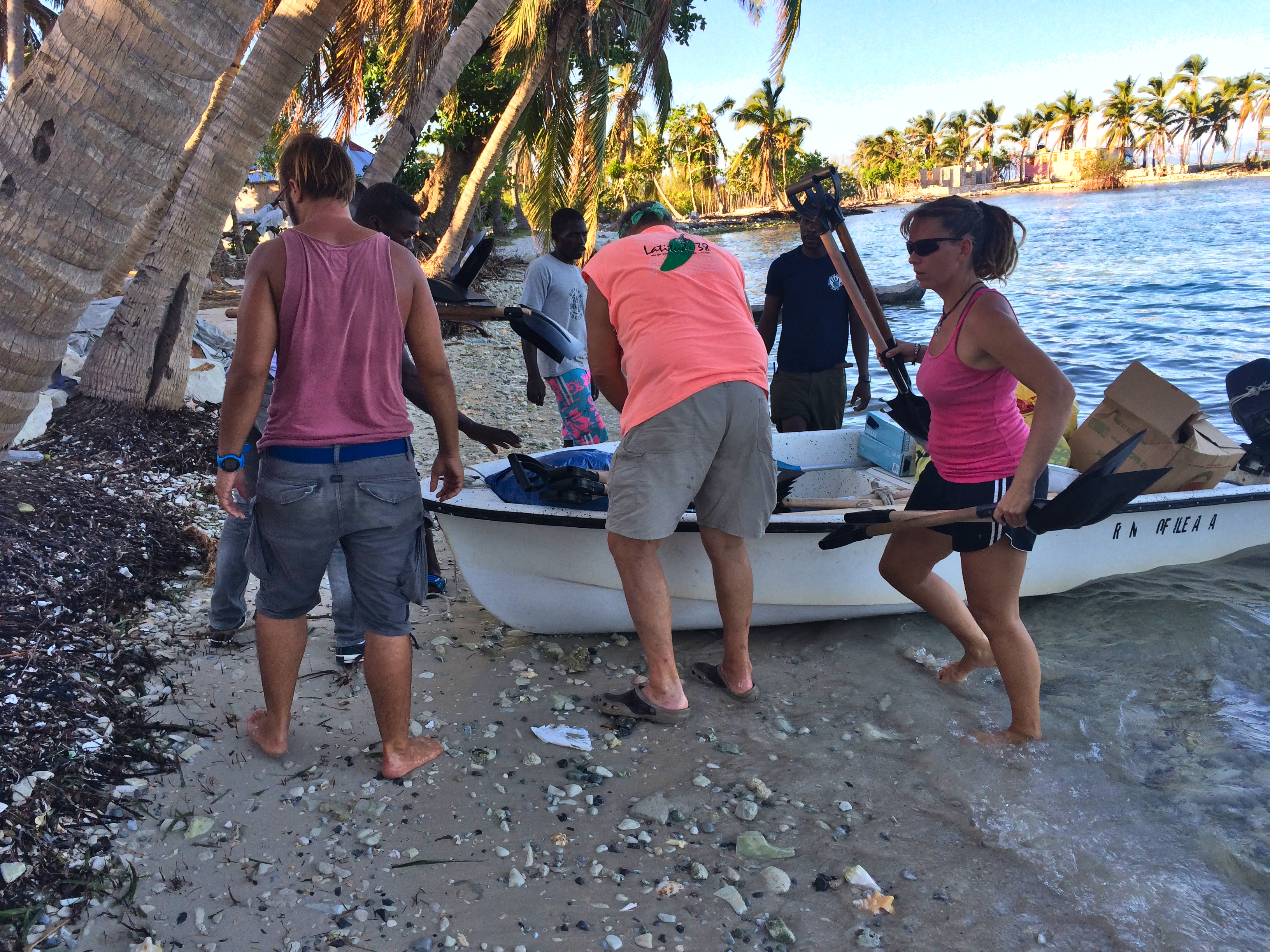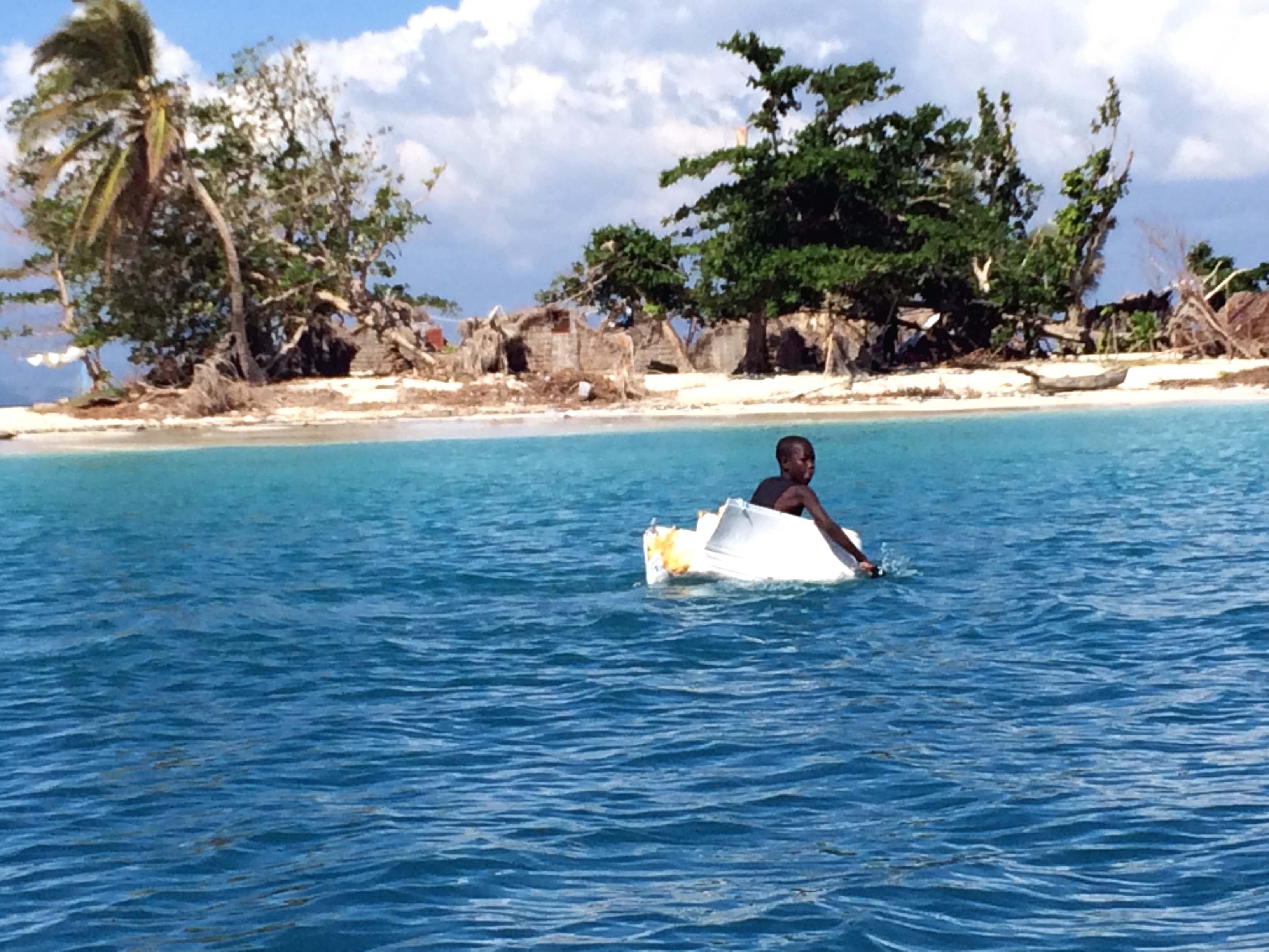 Wir hatten auf Bamba Maru kistenweise Verbandsmaterial, Antibiotika, Hygienepackungen, Überlebens- und Babynahrung Sets dabei und beschlossen mit dem Schiff direkt nach Madame Bernard zu segeln um den Medizinischen Teil der Ladung und den angehenden Arzt gleich beim Hospital abzuladen. Anschließend segelten wir zusammen mit der Tandemeer weiter zu den abgelegenen Inseln zwischen dem Festland und der Ile a Vache. Als wir in Sichtweite der Insel Ile Permantois kamen, liefen die Menschen bereits mit Kanistern und Flaschen an den Strand. Sie winkten uns aufgeregt zu und riefen "aqua-aqua". Wir warfen den Anker und holten ihre Behälter mit dem Beiboot ab. An Bord pumpten wir unsere beiden Wassertanks in ihre Kanister und brachten den Leuten Planen, Werkzeuge und Nahrungsmittel. Die Insel war kaum grösser als ein Fußballfeld, aber es lebten bis zu 70 Menschen dort. Ein massiver Mangobaum war umgestürzt und sein Wurzelwerk wurde notdürftig mit Stöcken und Planen abgedeckt. Da drin wohnte nun eine sechsköpfige Familie. Wie sie es geschafft hatten diesen Sturm zu überleben war mir ein Rätsel.