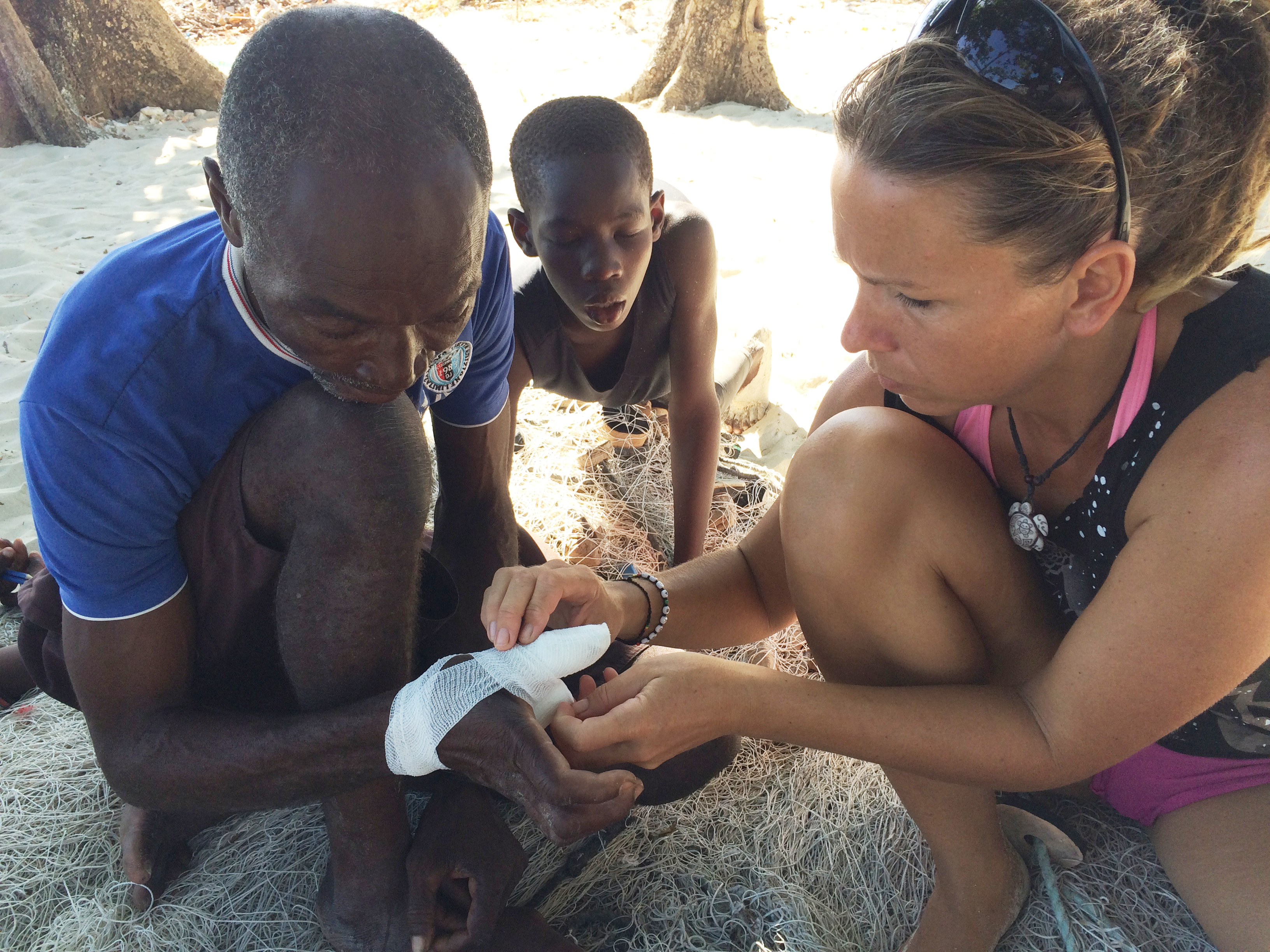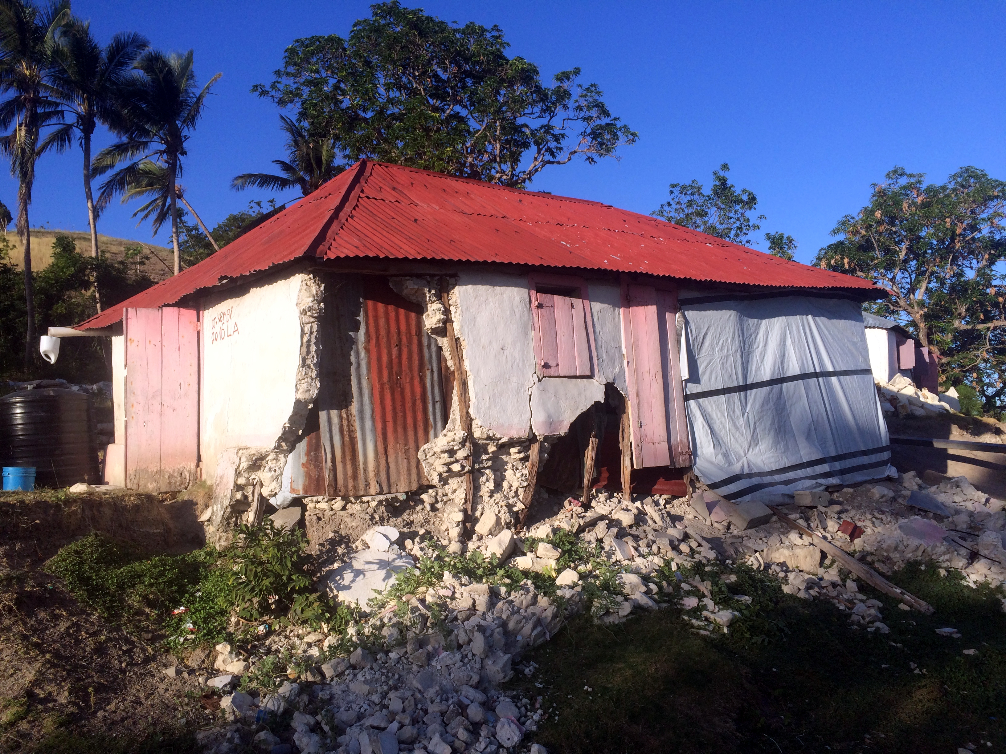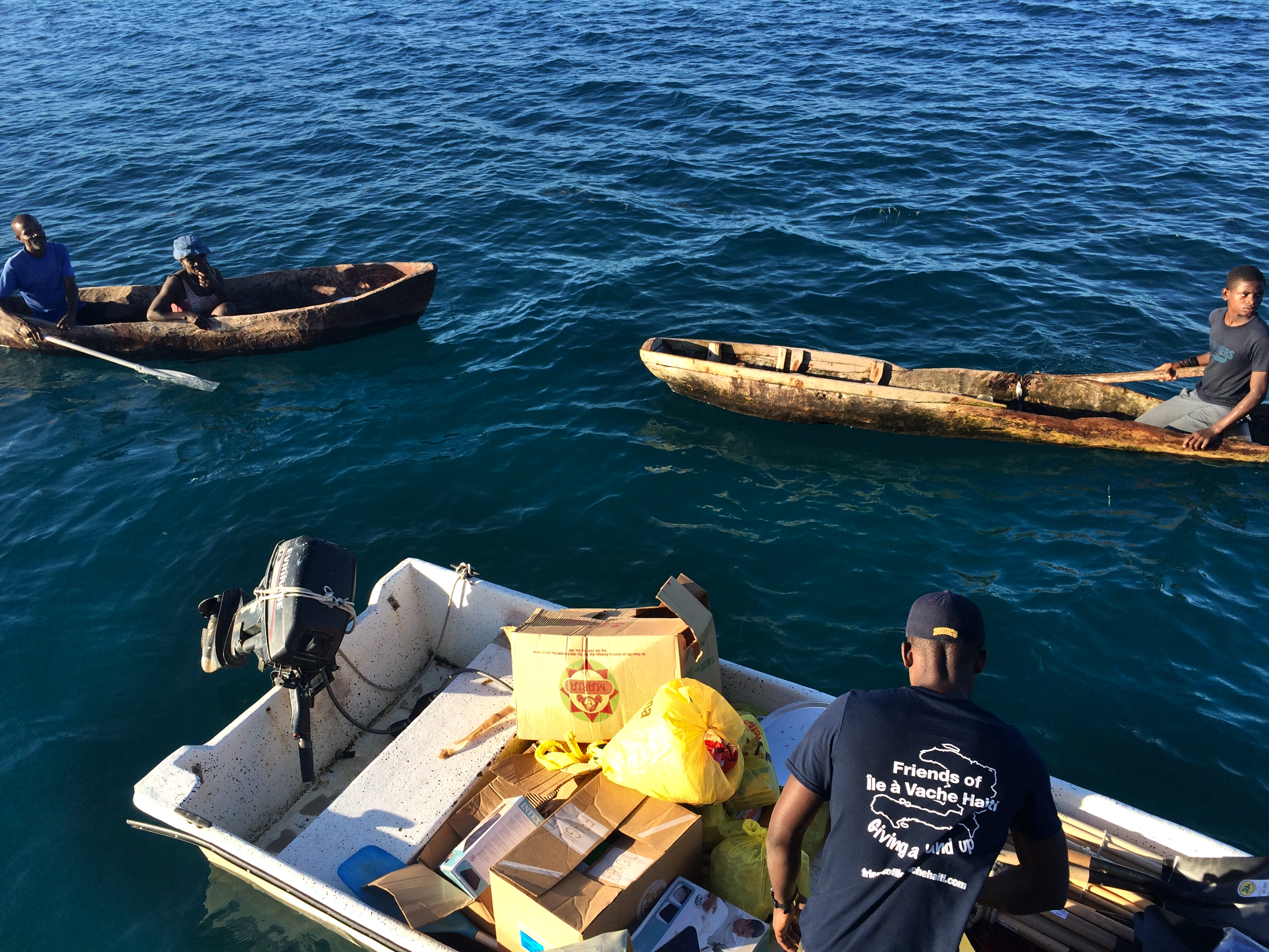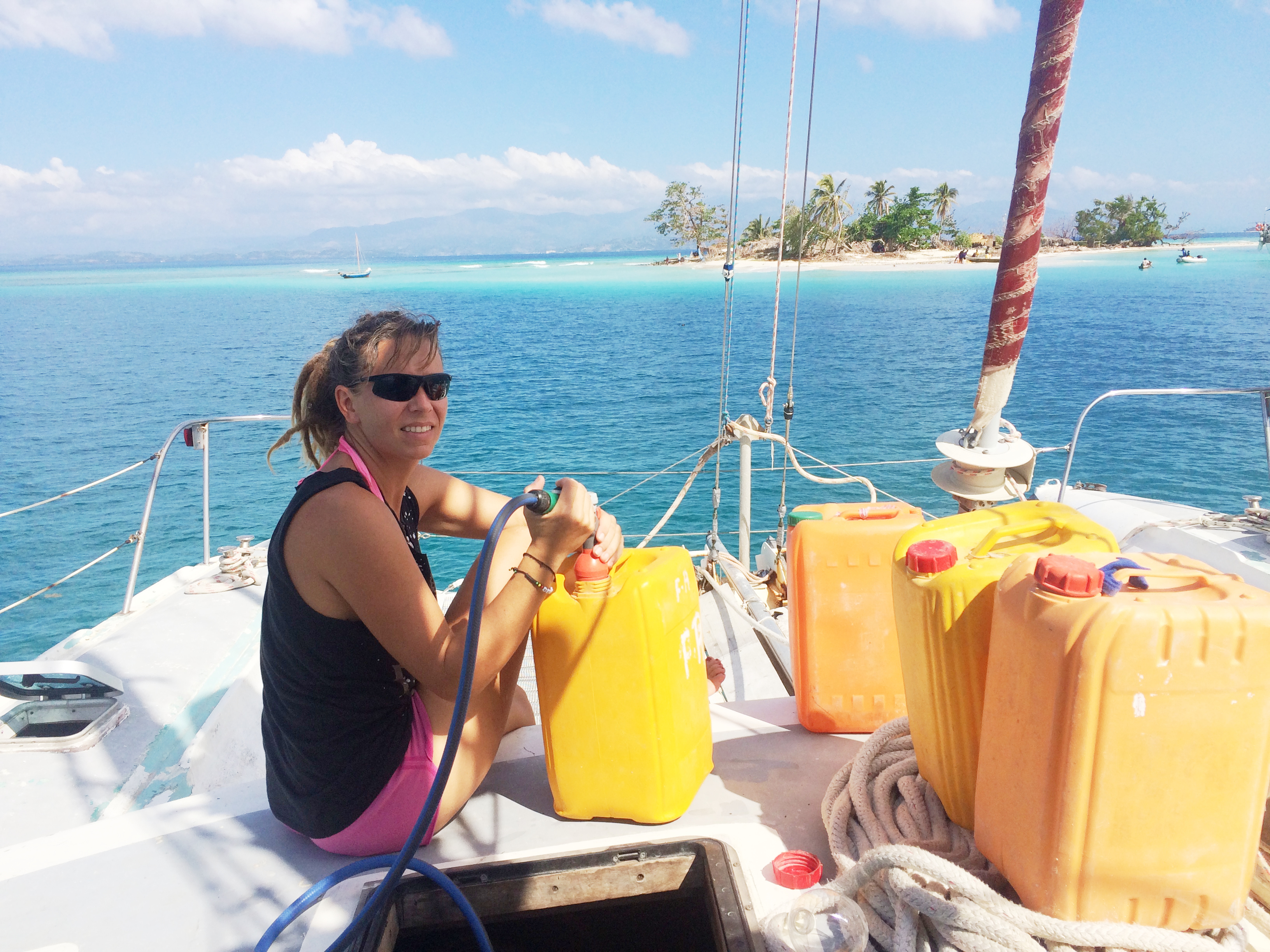 Wir hatten auf Bamba Maru kistenweise Verbandsmaterial, Antibiotika, Hygienepackungen, Überlebens- und Babynahrung Sets dabei und beschlossen mit dem Schiff direkt nach Madame Bernard zu segeln um den Medizinischen Teil der Ladung und den angehenden Arzt gleich beim Hospital abzuladen. Anschließend segelten wir zusammen mit der Tandemeer weiter zu den abgelegenen Inseln zwischen dem Festland und der Ile a Vache. Als wir in Sichtweite der Insel Ile Permantois kamen, liefen die Menschen bereits mit Kanistern und Flaschen an den Strand. Sie winkten uns aufgeregt zu und riefen "aqua-aqua". Wir warfen den Anker und holten ihre Behälter mit dem Beiboot ab. An Bord pumpten wir unsere beiden Wassertanks in ihre Kanister und brachten den Leuten Planen, Werkzeuge und Nahrungsmittel. Die Insel war kaum grösser als ein Fußballfeld, aber es lebten bis zu 70 Menschen dort. Ein massiver Mangobaum war umgestürzt und sein Wurzelwerk wurde notdürftig mit Stöcken und Planen abgedeckt. Da drin wohnte nun eine sechsköpfige Familie. Wie sie es geschafft hatten diesen Sturm zu überleben war mir ein Rätsel.