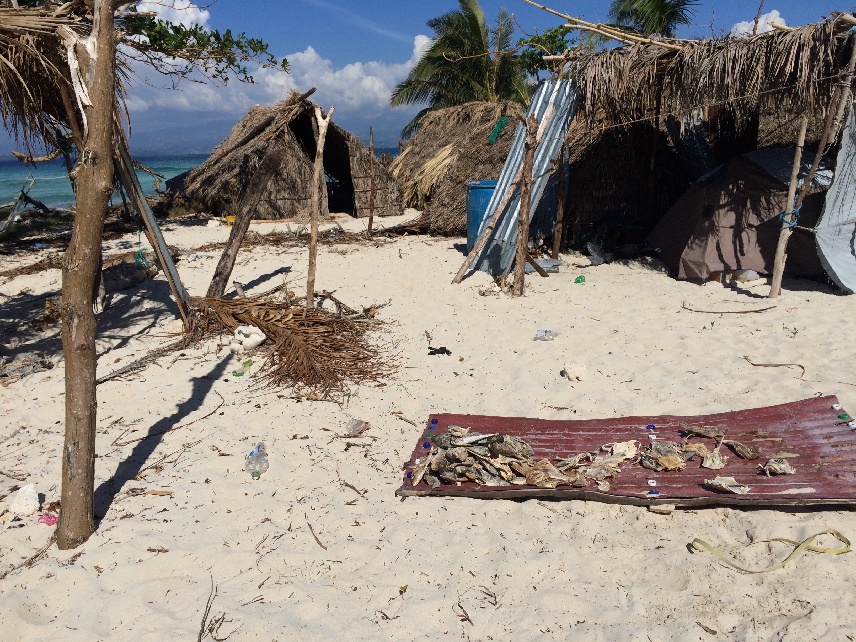 Sie erzählten uns dass sie in erster Linie vom Fischfang lebten und für Trinkwasser immer mit ihren ausgehöhlten Mangobäumen zur Ile a Vache segelten. Die Brunnen der Nachbarinsel waren nun aber verseucht und es gab kein sauberes Wasser mehr. Wir versprachen die Insel nun regelmäßig anzusteuern und ihnen Trinkwasser mit zu bringen. Sie waren trotz ihrer offensichtlichen Armut sehr Gastfreundlich und zeigten uns gerne wie sie lebten. Ihre kleinen Hütten aus Bananenblättern, Schilf und Bambus wurden alle vom Sturm zerstört. Ein paar wenige waren wieder notdürftig zusammen gebastelt aber das Baumaterial Palmblätter war weitgehend verschwunden. Sie verwerteten alles was aus dem Meer angespült wurde. Selbst die Segel ihrer Boote waren aus angeschwemmten Säcken, Folien oder Planen.