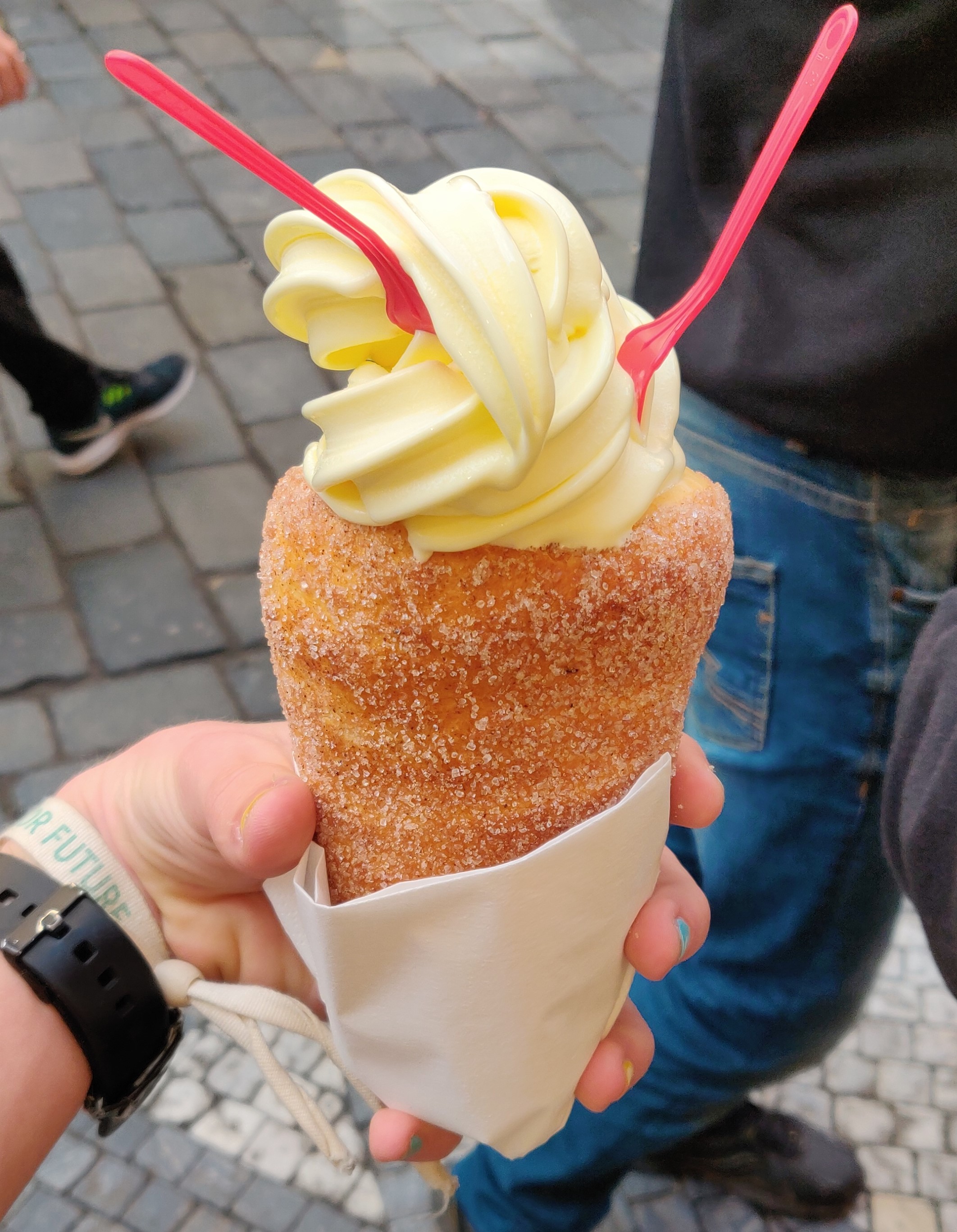 An dem zweiten Tag haben wir eine Rundfahrt in Prag gemacht und wir haben den Burg in Prag besucht. Aber was wirklich cool ist, ist dass wir es zufällig besucht haben, an dem Jubiläum des Prager Fenstersturzes, ein Vorfall, der in dem Jahr 1618 passiert ist, wo zwei Menschen aus einem Fenster rausgeworfen waren, und er markiert den Beginn des Dreißigjährigen Krieges. Also das war schon sehr interessant und von dem Berg hatten wir eine sehr schöne Aussicht und wir können vieles von dieser schönen Stadt gut sehen. Danach sind wir über die berühmte Karlsbrücke gelaufen und durch die Altstadt gegangen. Wir haben viele schöne und alte Gebäuden gesehen. Wir haben auch typisches tschechisches Essen probiert und trdelnik gegessen, was eine Köstlichkeit, die überall in Prag gibt. Nachdem wir all dies gemacht haben, waren wir müde und wir haben uns dafür entschieden zurück zu gehen und nachdem wir uns einmal mit der Straßenbahn verlaufen haben, sind wir wieder zum Hotel angekommen. Da gab es Abendessen und danach sind wir im Hotel geblieben und haben wir einfach herumgesessen und uns unterhaltet.