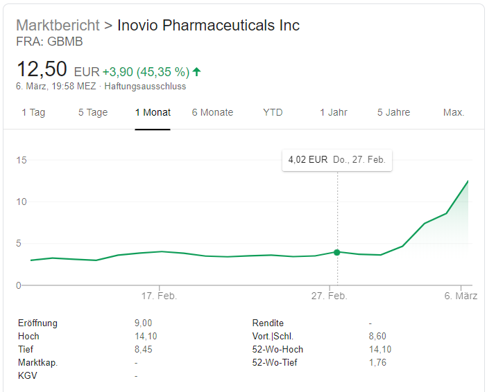 Die Aktie des US-amerikanischen Biotech-Unternehmens ist binnen einer Woche zeitwiese um das 3-fache gestiegen. Inovio Pharmaceuticals Inc. ist eines jener Unternehmen, welche einen Corona-Impfstoff entwickeln. Klinische Studien wurden jetzt von Sommer auf diesen Monat vorverlegt (Quelle). Irgendein Investor hat am Mittwoch stark investiert und einen Bullenrun ausgelöst
