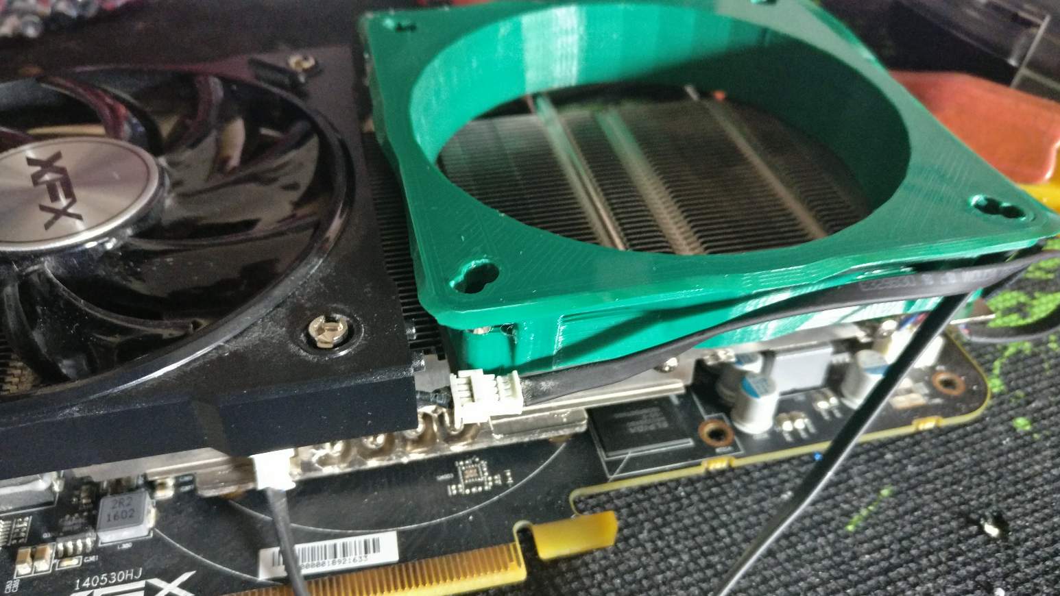Ich habe die Löcher auf dem Kühlkörper ausgemessen, die natürlich nicht mit einem einfachen Gehäuselüfter übereinstimmen, einen Adapter entworfen und den 3D Drucker angeschmissen. Wärmeleitpaste wurde in dem Zug nach 3 Jahren auch mal erneuert.
