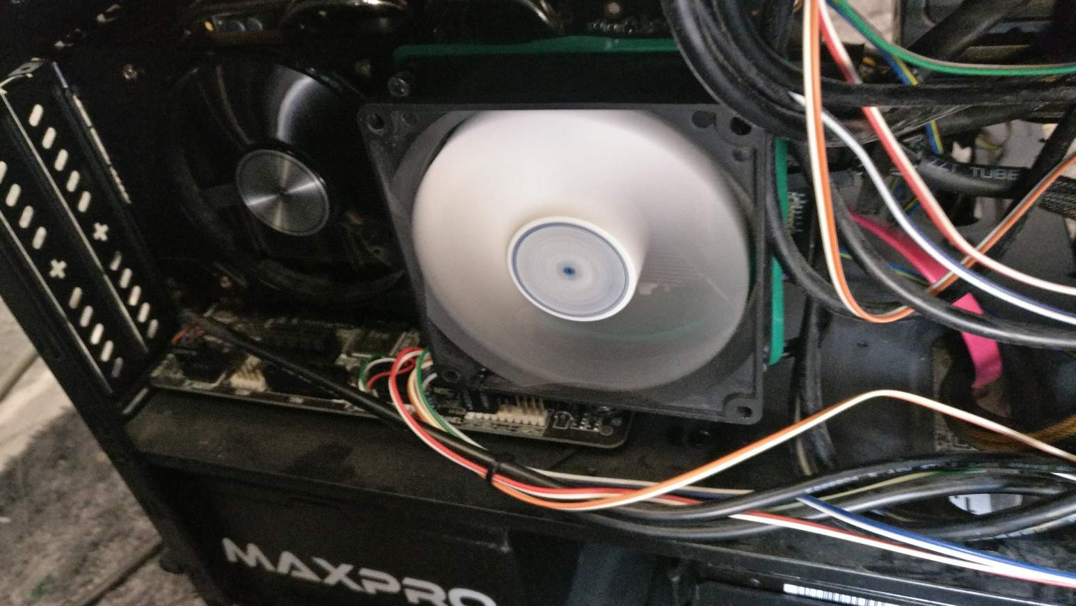 Das ist auf jeden Fall eine coole Lösung die du da gebaut hast. :-) Hast du den extra Lüfter am Mainboard oder der Grafikkarte angeschlossen?