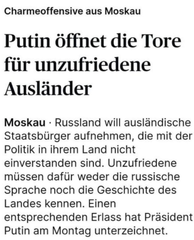 "Lol what a hilarious twist! 😂 It's amazing how some people think they can just pick up and move to another country to escape reality 🤣. The idea that Putin is welcoming 'unzufriedene Ausländer' (dissatisfied foreigners) with open arms is quite the joke 😂.