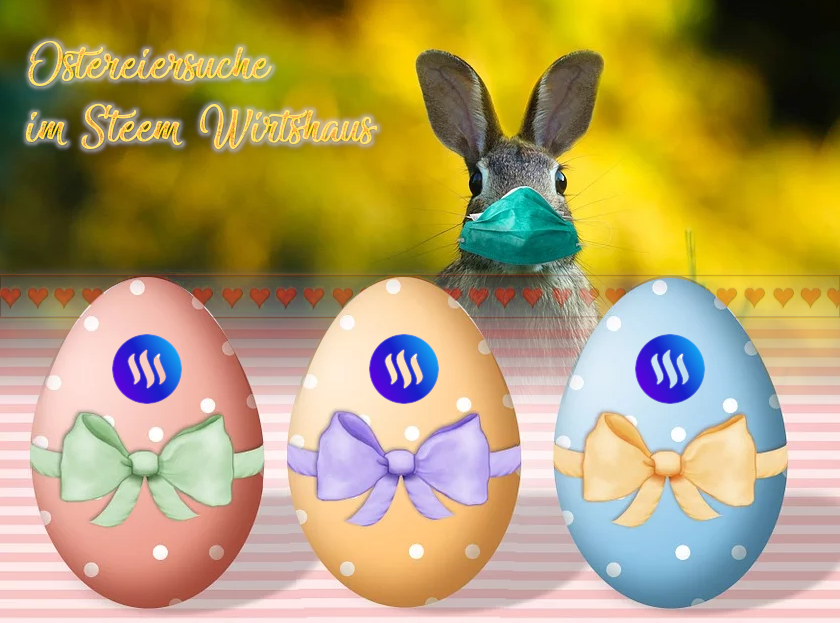Für alle die ihre Eier noch nicht gefunden haben, hiermit ist die Ostereiersuche im Wirtshaus eröffnet. Es gibt 3 mal 3 Steem abzustauben, wer ein zweites Ei findet, das gültet nücht!