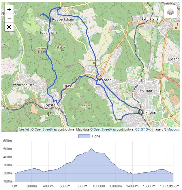 In Eppstein folgt man dem Radweg an der 455 und erreicht schnell wieder den Abzweig in Fischbach wo es via Gimbacher Hof oder alternativ schneller, über die Kelkheimer/Fischbacher Straße zurück zum Kelkheimer Bahnhof geht. Die Tour ist nicht unbedingt für Anfänger geeignet. Insgesamt müssen einige ziemlich steile Passagen erklommen werden und die Abfahrt nach Eppstein ist nicht ganz ohne. Unterwegs gibt es aber Einiges zu sehen und abwechslungsreiche Bodenbeläge. Das Highlight ist natürlich die Aussicht vom Turm.