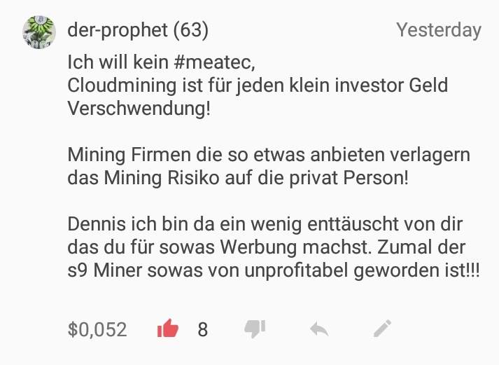 Er kann ja von mir aus Werbung machen das finde ich auch legitim. Dann soll er aber wenigsten seriös vor risiken beim Mining warnen!