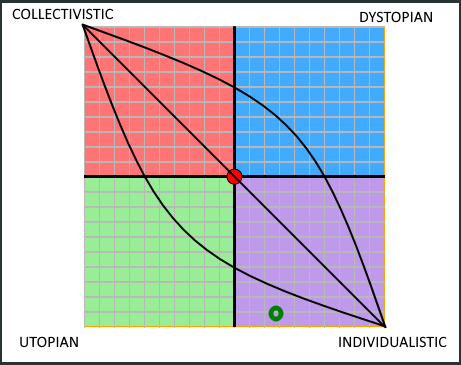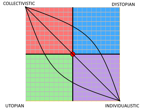 Das Äußerste der Quadranten Dystopisch sowie Utopisch können nicht erreicht werden, da zum erreichen dieser ein zunehmendes Maß an (meist) Kollektivismus bzw. (selten) Individualismus erforderlich ist.