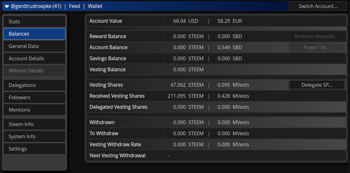 Die SBD-Einnahmen in Höhe von 0.549 habe ich bei @schlunior eingezahlt.Da ich es gerne glatt mag, habe ich den Erlös auf 2.000 SBD von meinem @condeas - Account aufgestockt.