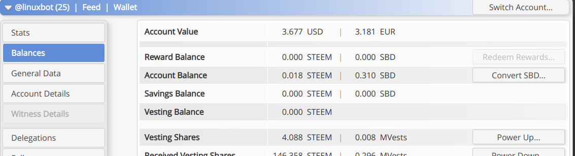 Eine weitere Lösung ist die SP des Accounts anzuheben, um durch Vote-Selling an flüssiges Steem und SBD zu gelangen.Hierfür muss aber die Stärke der Votes des Autovoter massiv heruntergefahren werden.