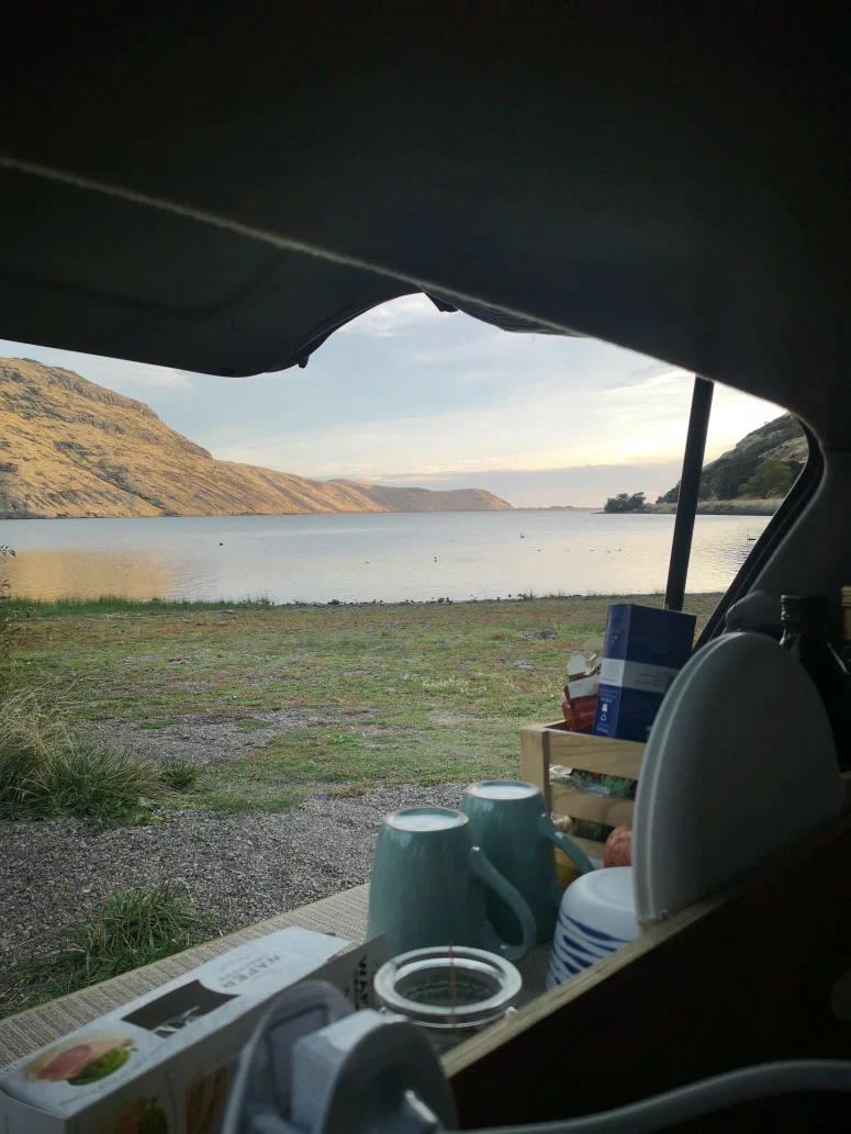 Nach der Wanderung wusste ich nicht so genau wo ich übernachten sollte. Eigentlich wollte ich auf einem der Hügel ein Plätzchen suchen, entschied mich aber wegen des starken Windes dagegen und fuhr schon ein Weilchen Richtung Christchurch an einen See an dem es einen Stellplatz gibt und ein Klo. Neben Enten und schwarzen Schwänen