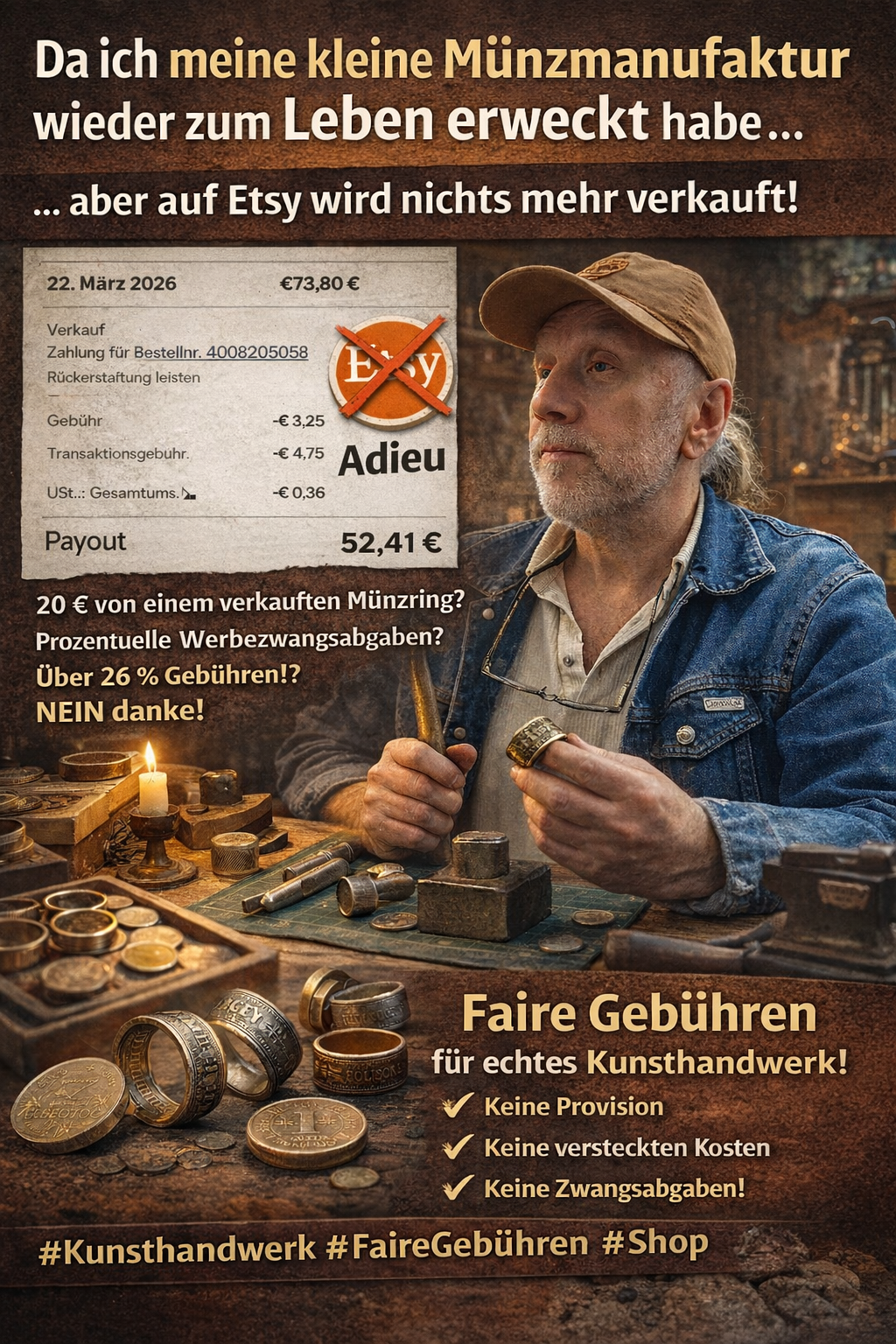 #Etsy #Gebühren #Kunsthandwerk #ChinaSchrott #Münzring #Plattform #SocialMedia #Blockchain #Zensur #Meta #Facebook #Gewinnoptimierung #Boykott #Kunsthandwerker #FaireGebühren #TieferDunklerWald #AlterMannImWald #ContentCreator #NieAufgeben #Schmuckmanufaktur