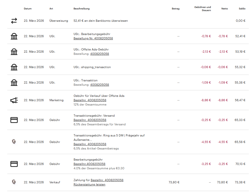 Hier am Ende mal der Screenshot von der Abrechnung von einem einzigen Ring, den ich über diese Plattform verkauft hatte. Ich beende meine Geschäftsbeziehung mit dem heutigen Tag, denn solch eine Plattform unterstütze ich genauso wenig, wie ich noch das Unternehmen Meta unterstütze 🚫