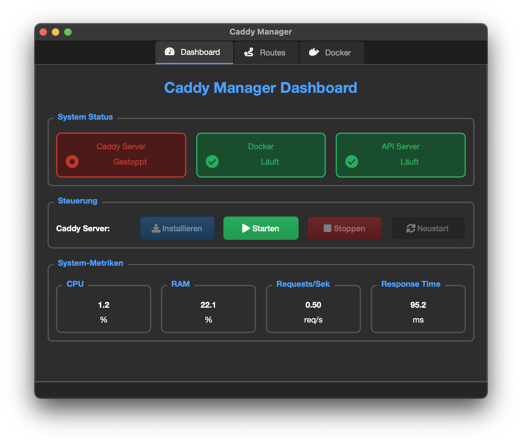 Der Caddy Manager ist eine Desktop-Anwendung, die ich mit Python entwickelt habe. Sie besteht aus einem FastAPI-Backend und einer PySide6 (Qt6) Frontend-Anwendung.