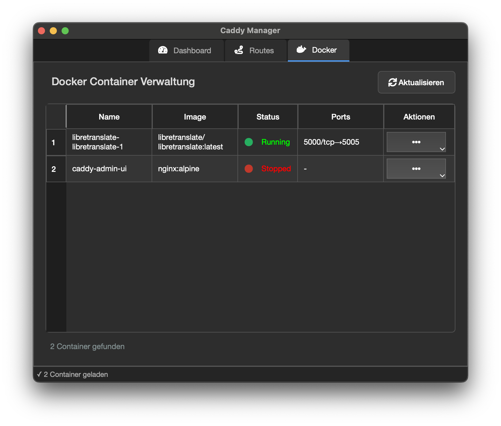 - Docker Integration: Container direkt aus der App starten und stoppen