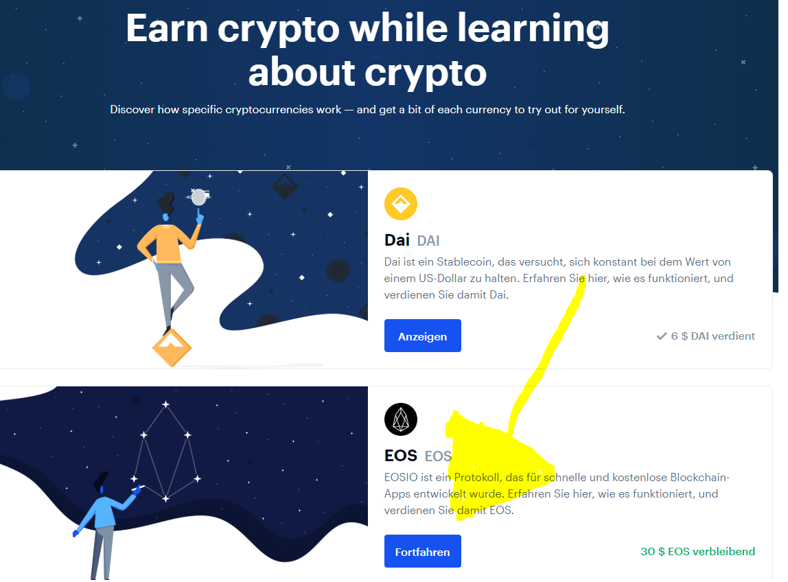 Coinbase ist eine weltweit anerkannte Handelsplattform für Kryptowährungen. Seit einiger Zeit bietet Coinbase ein Projekt namens Coinbase Earn an. Dabei kann sich der Kunde ein paar zwei- bis dreiminütige Werbevideos zu verschiedenen Kryoptowährungen anschauen und für das erfolgreiche Beantworten einer Quizfrage im Anschluss bekommt er dann 2-50$ in der entsprechenden Kryptowährung. Um an dem Programm teilzunehmen, muss man sich bei Coinbase anmelden und vermutlich auch verifizieren.