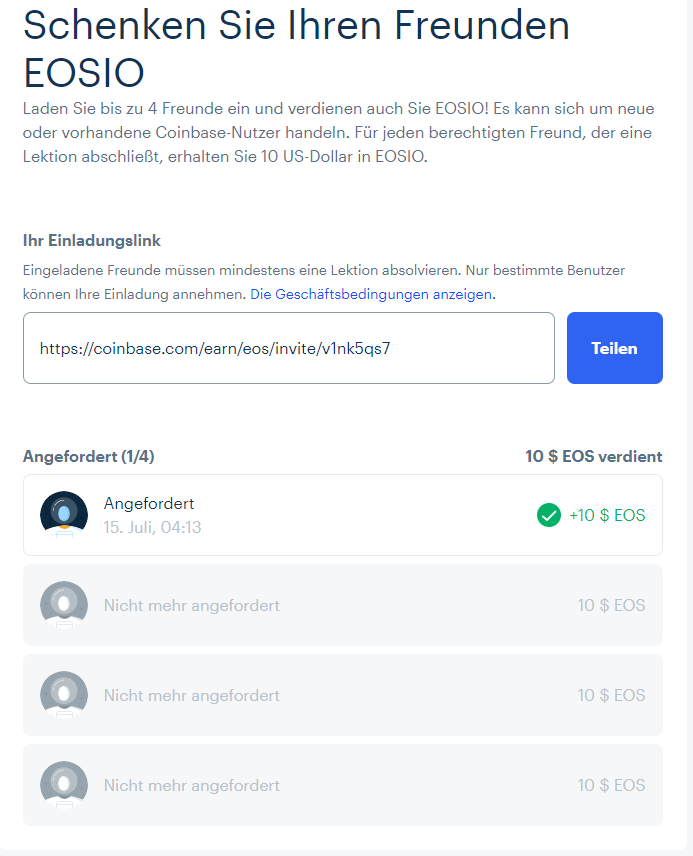Damit ich noch mehr Kryptowährungen (in diesem Fall EOS und XLM) bekomme, muss ich Freunde zu diesem Programm einladen. Ich muss Dich dazu bringen, auf meinen Link zu klicken und Du musst dann dort für Dich die kostenlosen Kryptowährungen einsammeln. Dabei ist es sogar egal, ob Du schon einen Coinbase Account besitzt. Es geht nur darum, dass du noch die kostenlosen Kryptowährungen einsammeln kannst.