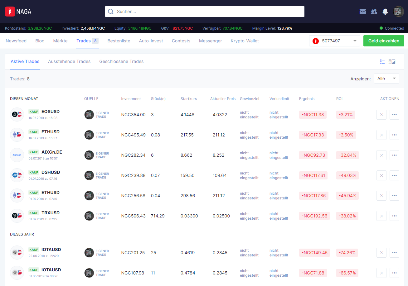 Mein NGC Konto ist tiefrot. Auch hier bezahle ich praktisch keine Haltekosten der Positionen im Kryptobereich. Da ich von langfristig steigenden Kursen ausgehe. Bei Naga werden Kryptopositionen nicht gehebelt.