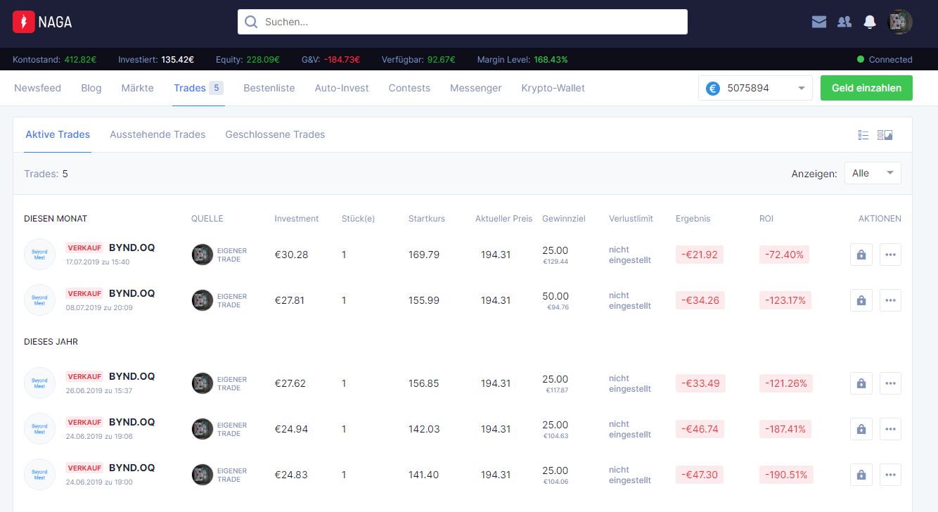 Mit meinem Euro-Konto habe ich 5 Shorts auf Beyond Meat platziert und bin 184€ in Minus