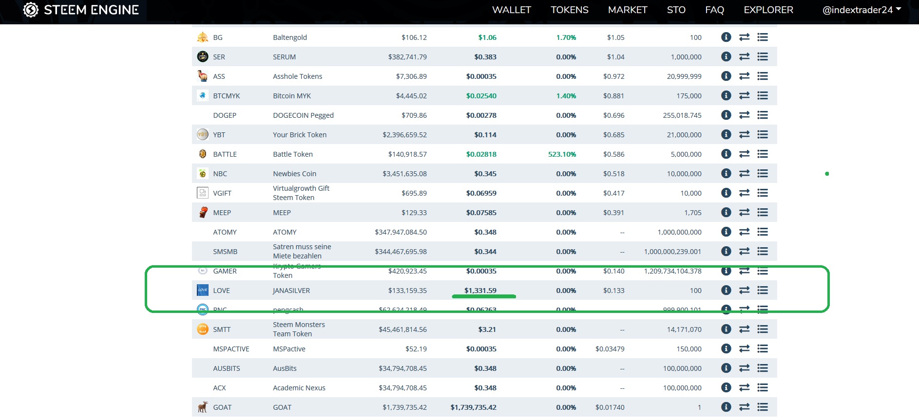 Der Anstieg des JANASILVER LOVE TOKEN AUF 66000 Steem je Love macht den LOVE Token bzw seine Anteile erneut zum nominal wertvollsten Token der Welt, in dem der Markt LOVE Anteile derzeit mit über 27000 US-Dollar bewertet. Der Anstieg auf nominal über 27000 Dollar je LOVE sollte dabei langfristig weiteres Aufwärtspotential freisetzen.
