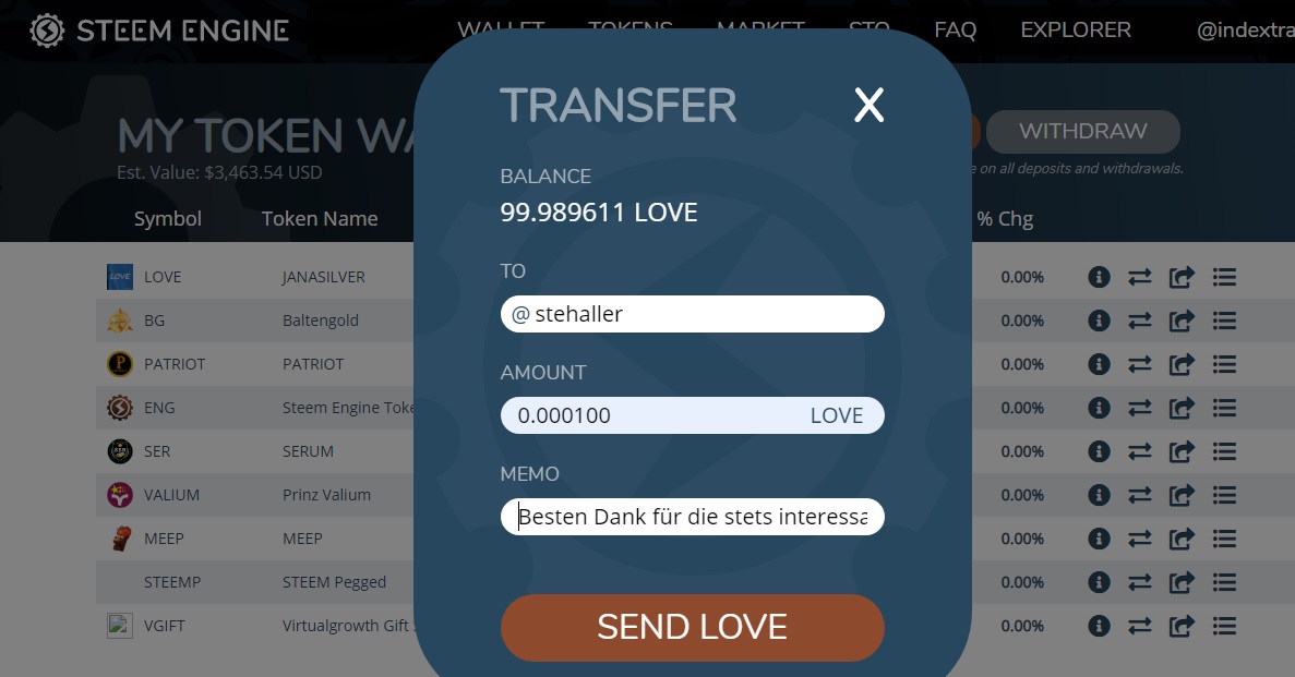 Alle oben genannten Nutzer haben ihre LOVE Token Rewards des JS-LOVE Token Silver Projektes bereits per SEND LOVE Button Fuktion über die Steemengine von mir in ihre wallet bei der Steemengine übersendet bekommen. Damit teile meinen Gewinn mit Euch. Denn ohne Eure Upvotes wäre die Schaffung neuer Werte und einer besseren Welt nicht möglich. Dabei ist stets die Resonanz von Euch massgeblich für die Ausgabe von Anteilen am JS-LOVE Token - nicht mehr aber auch nicht weniger.