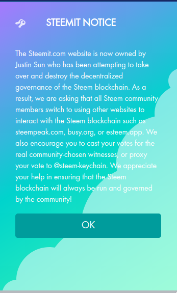 Also, da wollte ich gerade einen Kommentar abschicken und mich mit dem Steem Keychain legitimieren, erzählt mir doch die Plakette man solle doch bitte nicht steemit.com verwenden, sondern so Sachen wie Steempeak, Busy usw. weil dort der olle Justin keinen Einfluss hätte. Also krame ich in meiner Startseite den Link für Steempeak hervor, den ich schon lange in petto, aber selten verwendet habe und schreibe den Artikel hier. Sollte es wirklich so einfach sein, den Einfluss von ihm zu reduzieren, sollte das noch etwas mehr an die Öffentlichkeit.