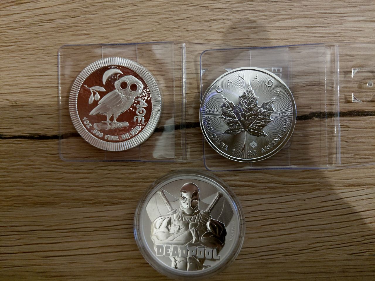 Man sieht hier die Silber Eule 1 Unze, eine der Preiswertesten Anlagemünzen, die man so bekommt. Sowie die Silber Maple Leaf 1 Unze, ebenfalls eine preiswerte Anlagemünze welche durch die kleine Lasergravur unten rechts (ebenfalls ein Maple Leaf) wohl zu der fälschungssichersten Münze zusätzlich gehört.