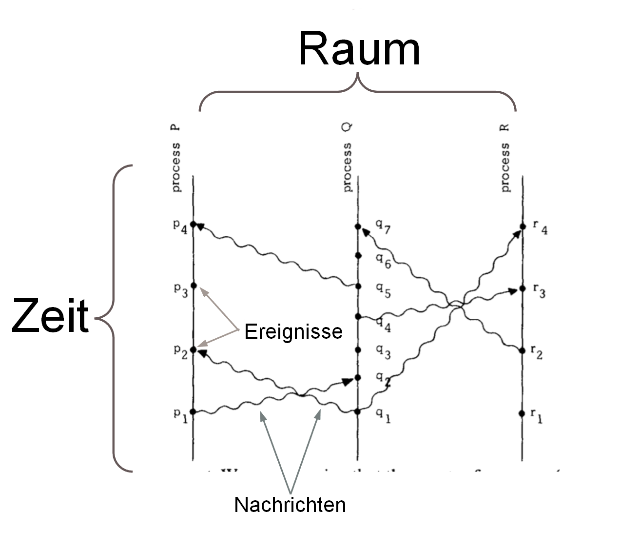 [Nach Lamport, L. (1978). "Time, Clocks and Ordering of Events in a Distributed System"] ... Ein Prozess ist einfach ein Computer die räumlich (was auch immer zeitlich bedeutet) getrennt sind