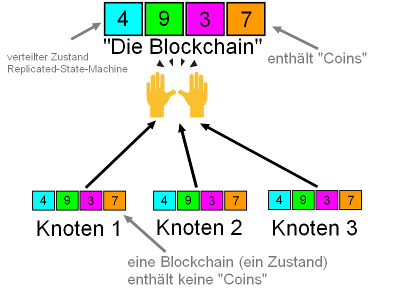 Nicht nur das Rechnersystem sondern auch der Algorithmus soll machen wozu er angedacht ist. Im Falle des Bitcoinprotokolls ist es >>Konsens über den Zustand der Blockchain zu treffen<<. Die verteilte Blockchain ist der Zustand, sie ist Konsens.
