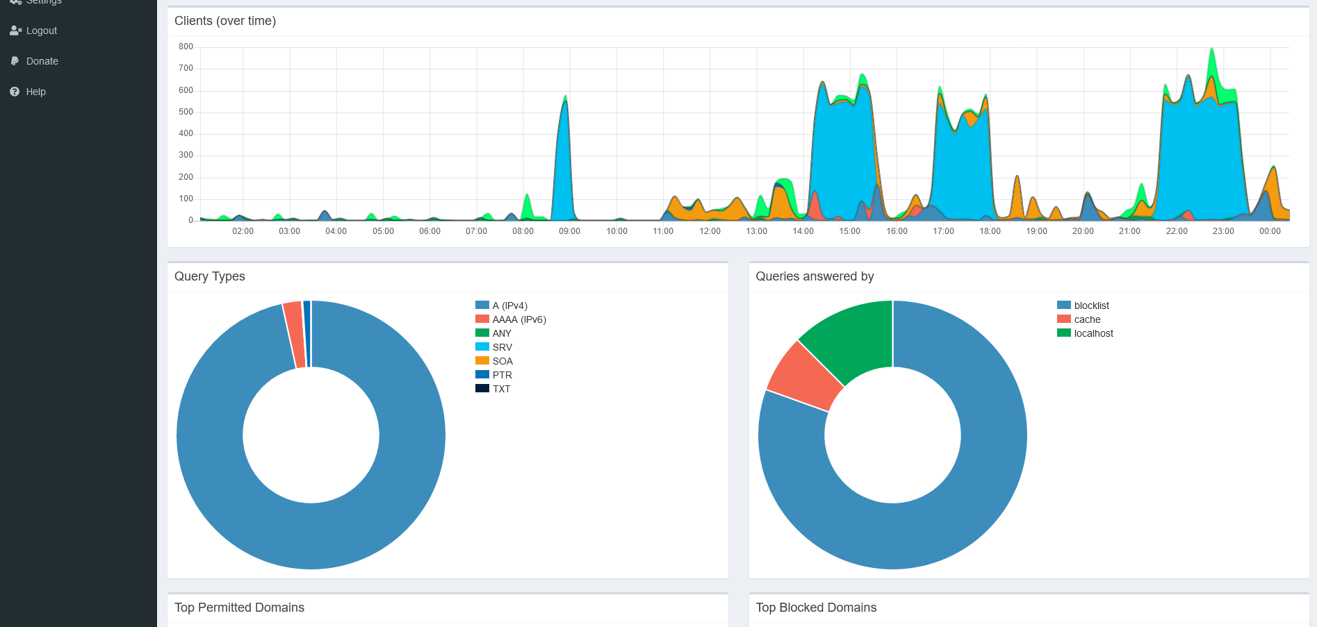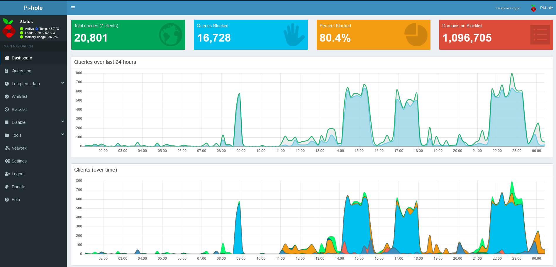 Hier einige Bilder aus der Praxis. So sieht das Dashboard von Pi-Hole aus. Sehr gut anhand der Spitzen zu sehen ist das Einschalten des Smart TV´s. Beachtlich ist außerdem das 80% der Anfragen geblockt werden. Das zeigt deutlich wie kommunikationsfreudig bestimmte Geräte nach außen sind.