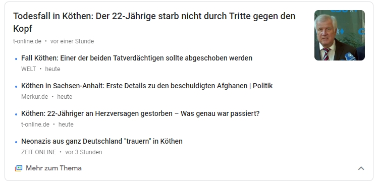 Für mich sieht die erste Überschrift eher so aus, als ob das wieder mal so ein Gerücht war, dass sich als Luftnummer herausgestellt hat. So wie der zweite Tote in Chemnitz.