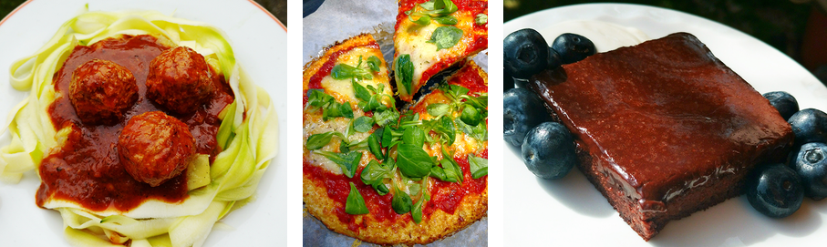 (1) "Zoodles" mit "Fleischbällchen" (2) Pizza mit Blumenkohlboden (3) Brownie ohne Mehl und mit Erythritol