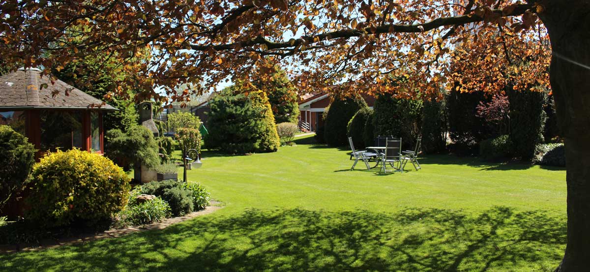 Eine schöne Sommerlandschaft mit viel Bäumen und Sträuchern verspricht Zeit für Ruhe und Besinnlichkeit!