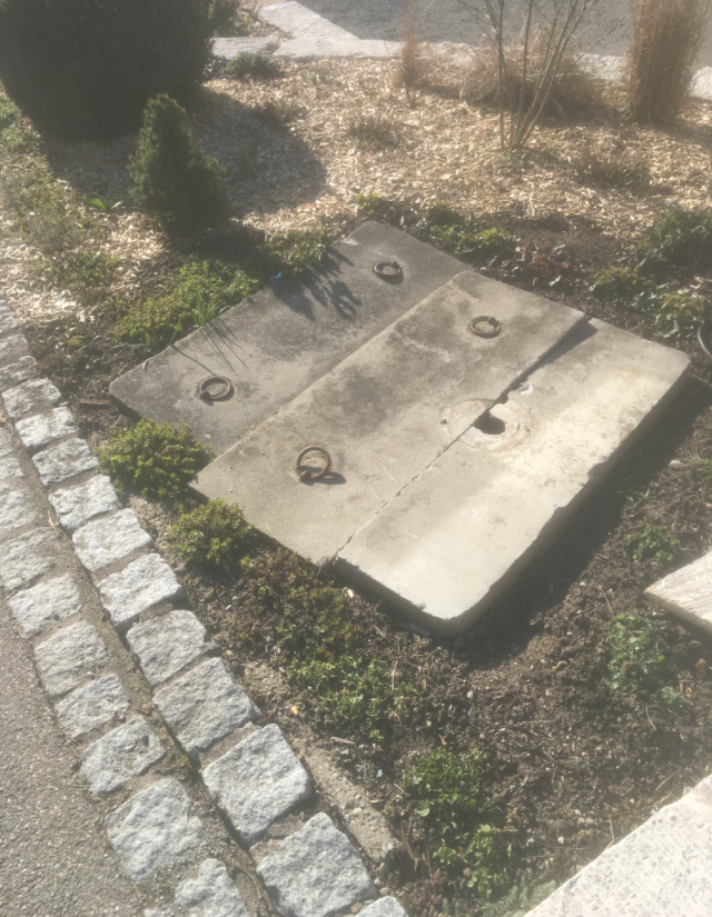 Auf dem Brunnenschacht liegen 3 große Betonplatten.