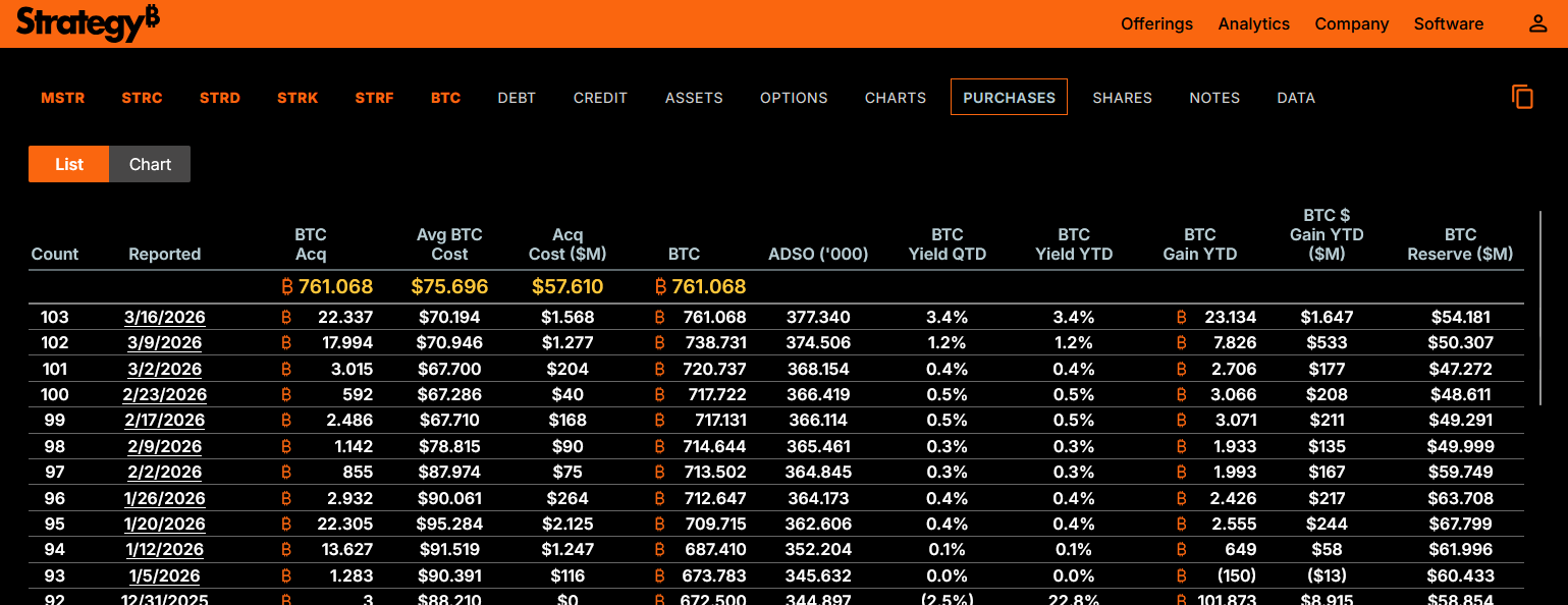 This time, it was 22,337 Bitcoin at $70,194 each. This meant the purchase price per coin was even lower than the previous week, and the average price of all purchases dropped to $75,696—a decrease of $166.