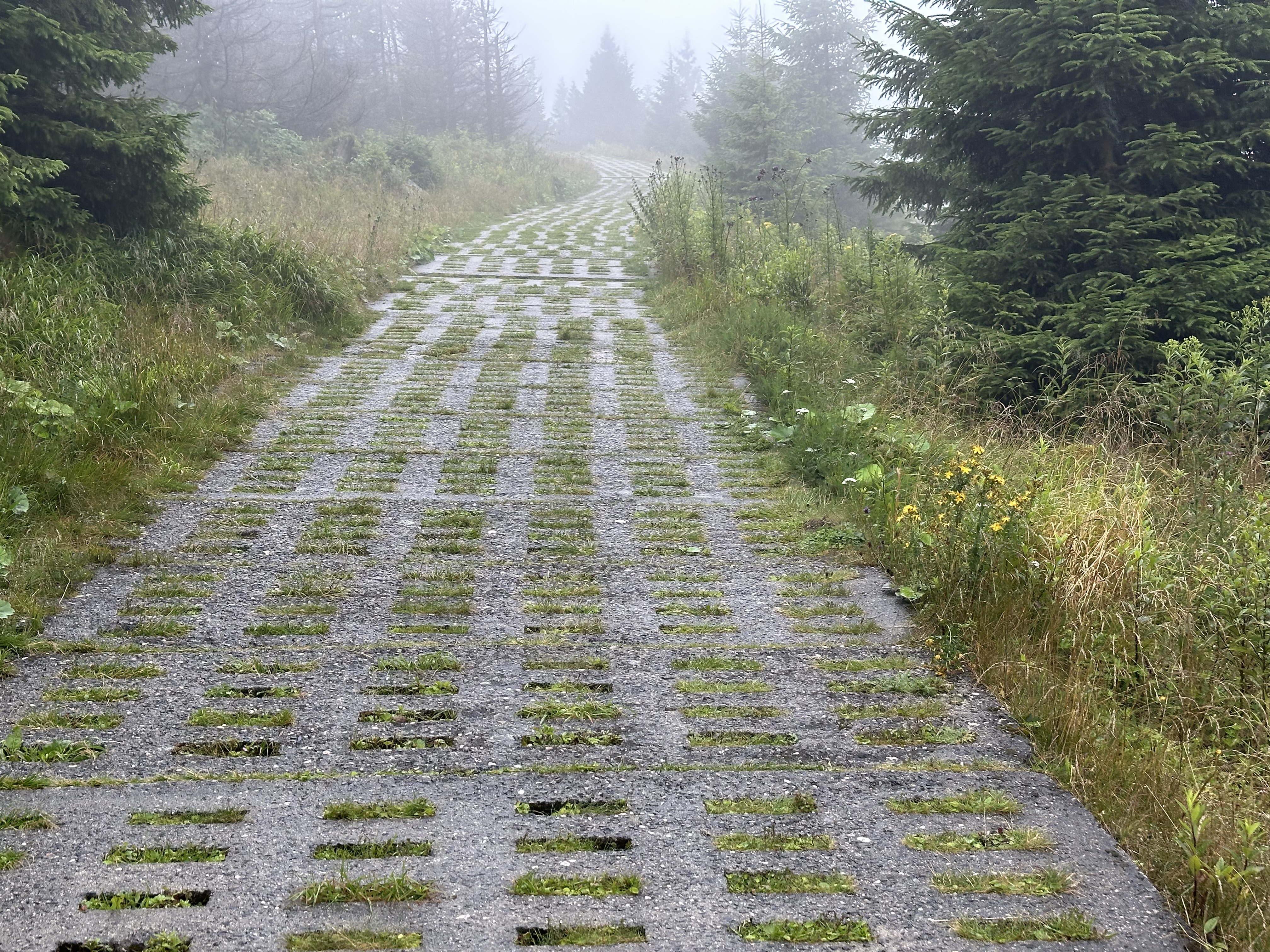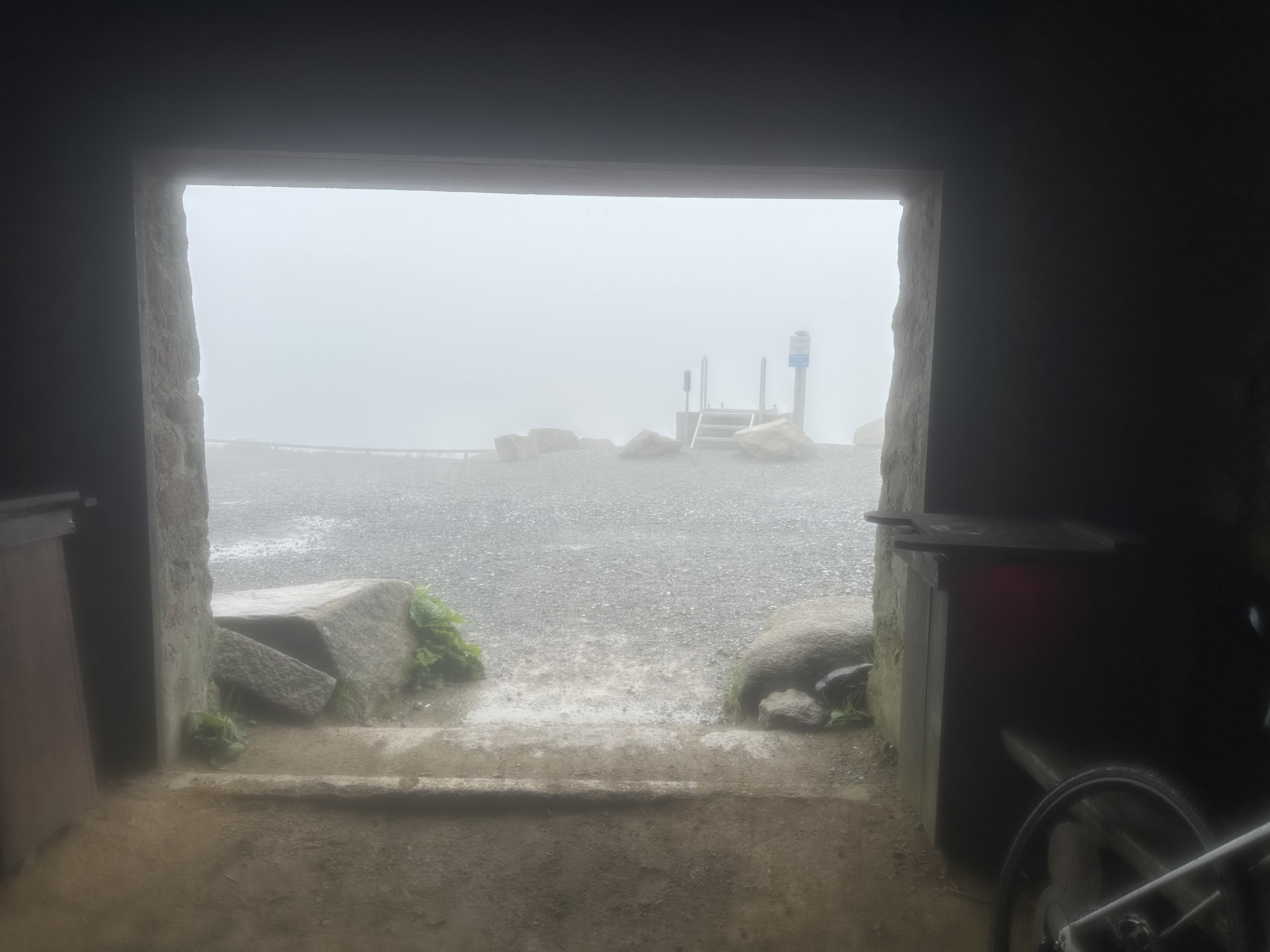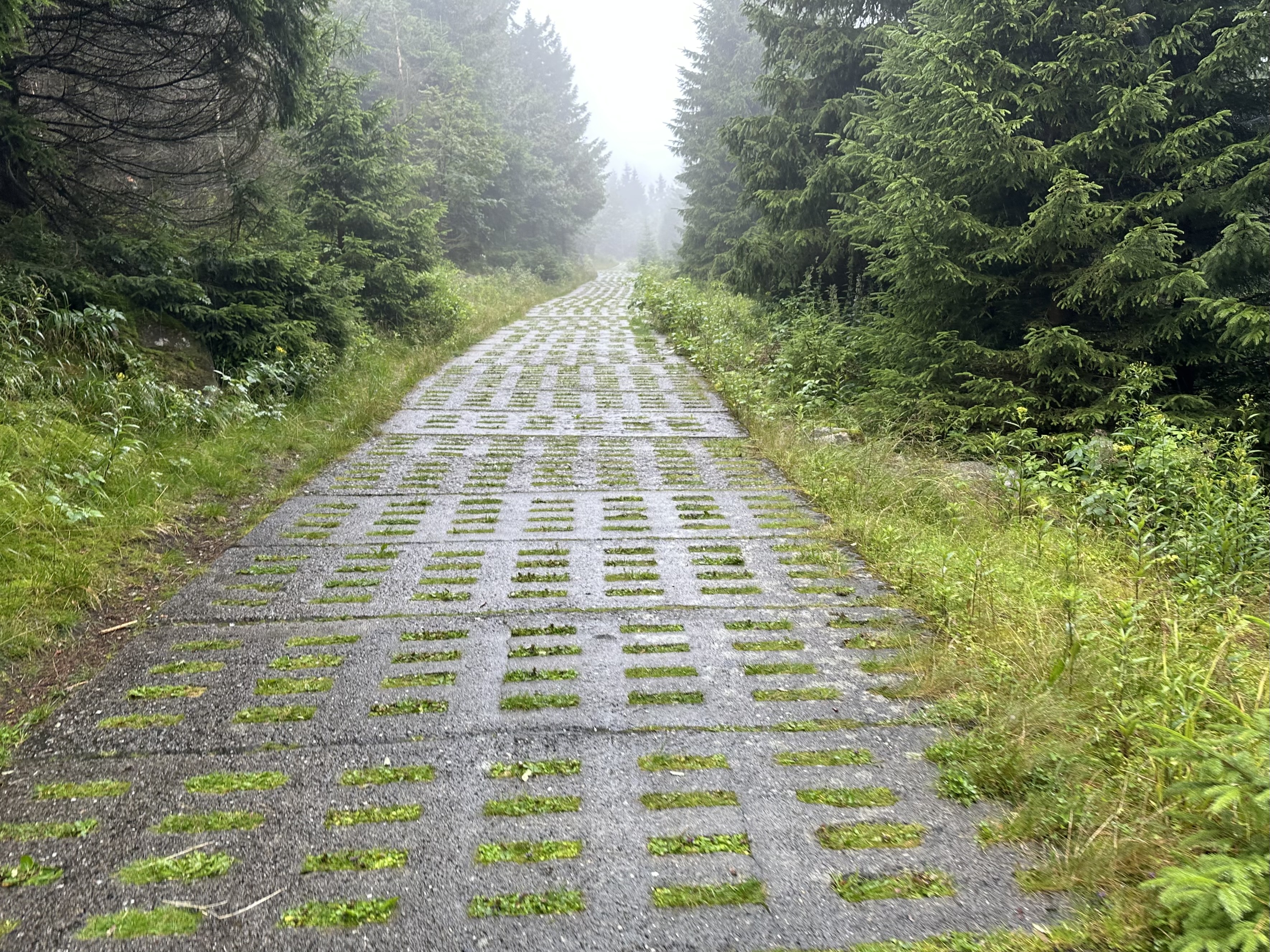 Es nieselte und regnete dann später gleich ab dem ersten Meter und bis zum Ende. Oben im Wolkenhäuschen war ich klitschnass und die (Bar-) Füße in den Sandalen waren eisekalt, die musst´ich dann erstmal warm- massieren. In der Regenhose, die die Schuhe von oben überstülpen, ging es den Füßen besser als gedacht, während das Wasser nur so an mir herablief. Einen ganz schön verregneten Sommer haben wir da bekommen.