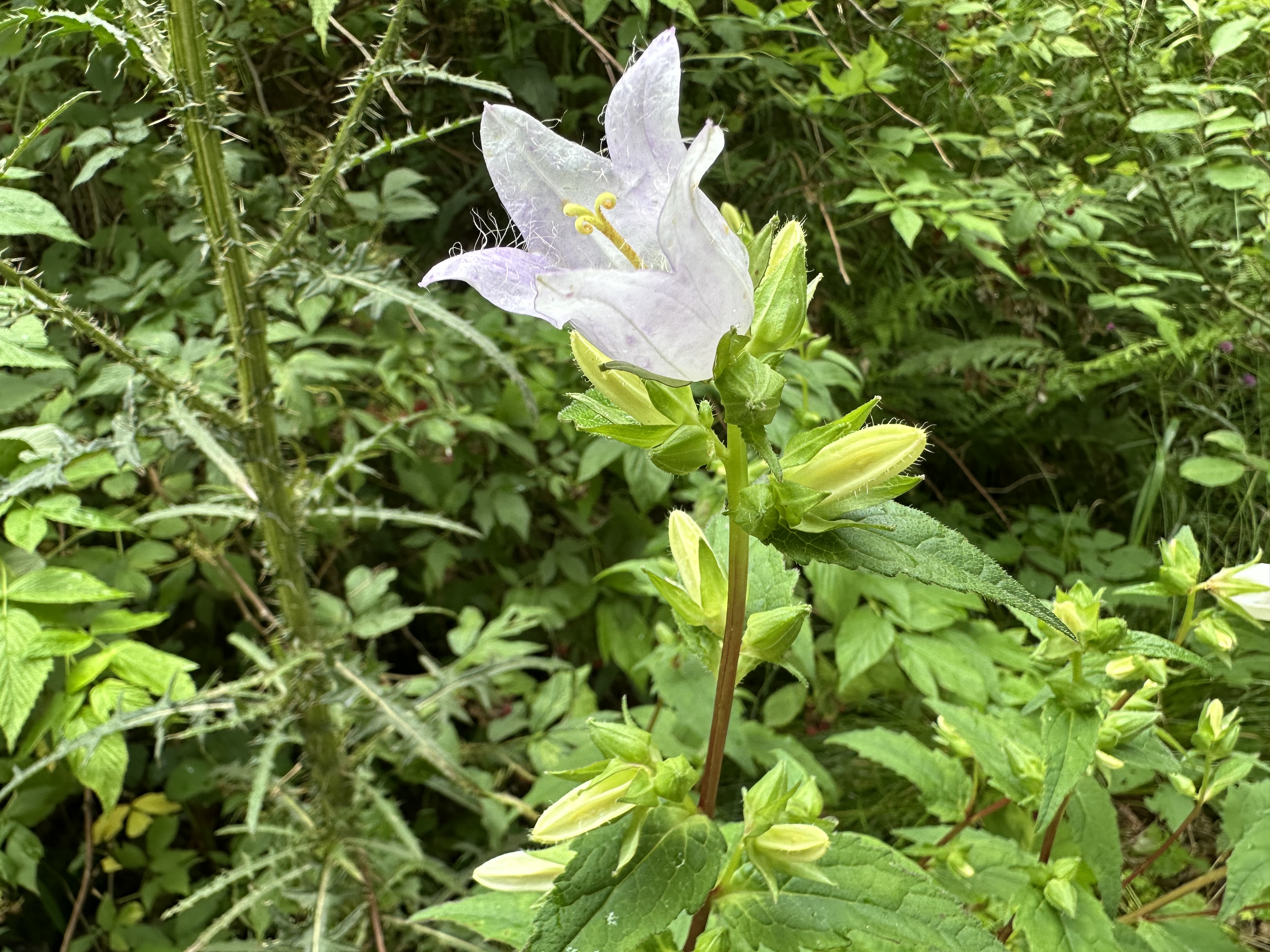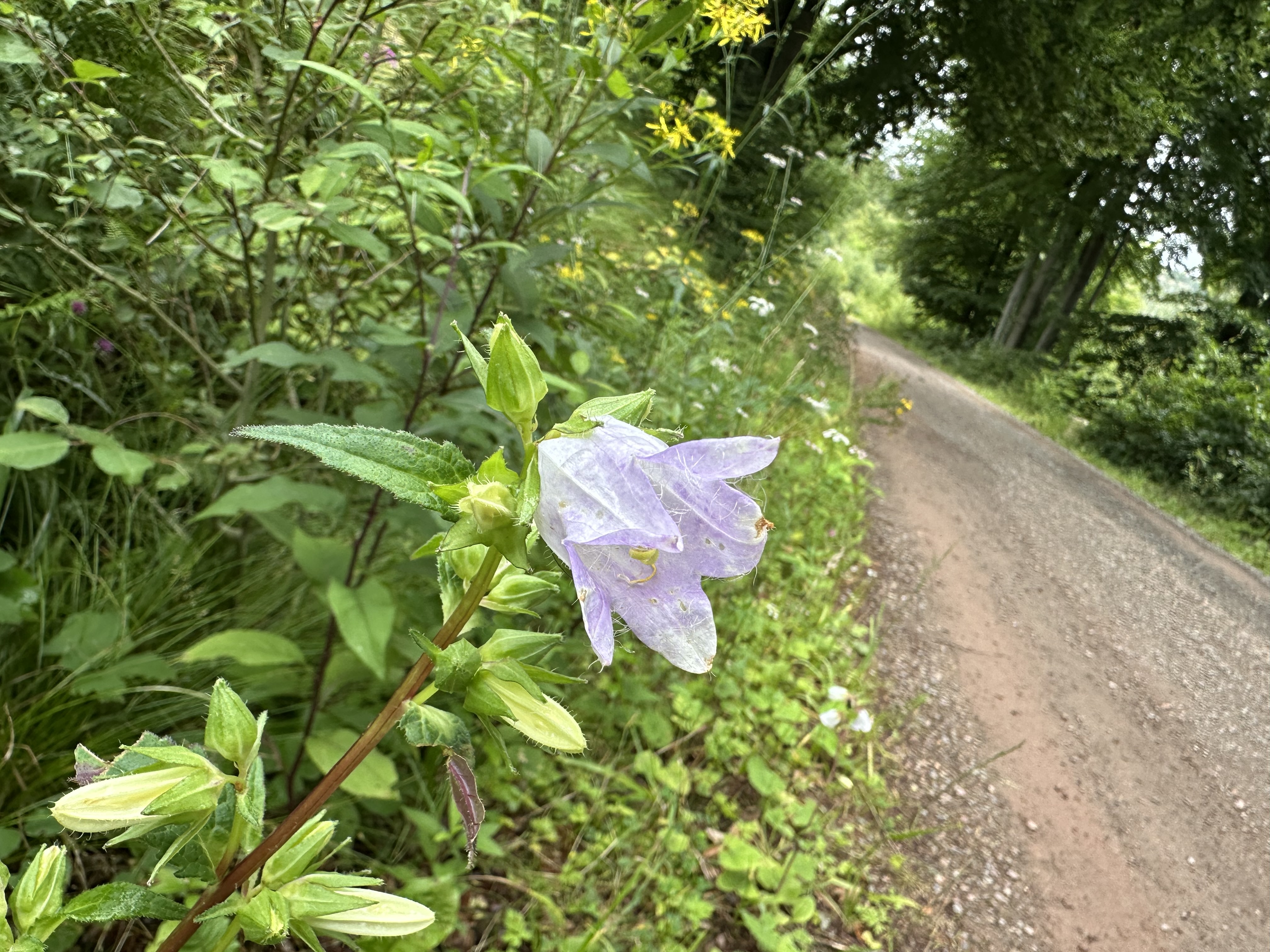 Eine Nesselblättrige Glockenblume ist das auf dem Titelbild, gemäß Fotoinfo. Das würde ich so auch unterschreiben, bis sie blüht sieht sie, von den Blättern her, ein wenig aus wie eine Brennnessel. Die Wildblume ist häufig zu sehen.