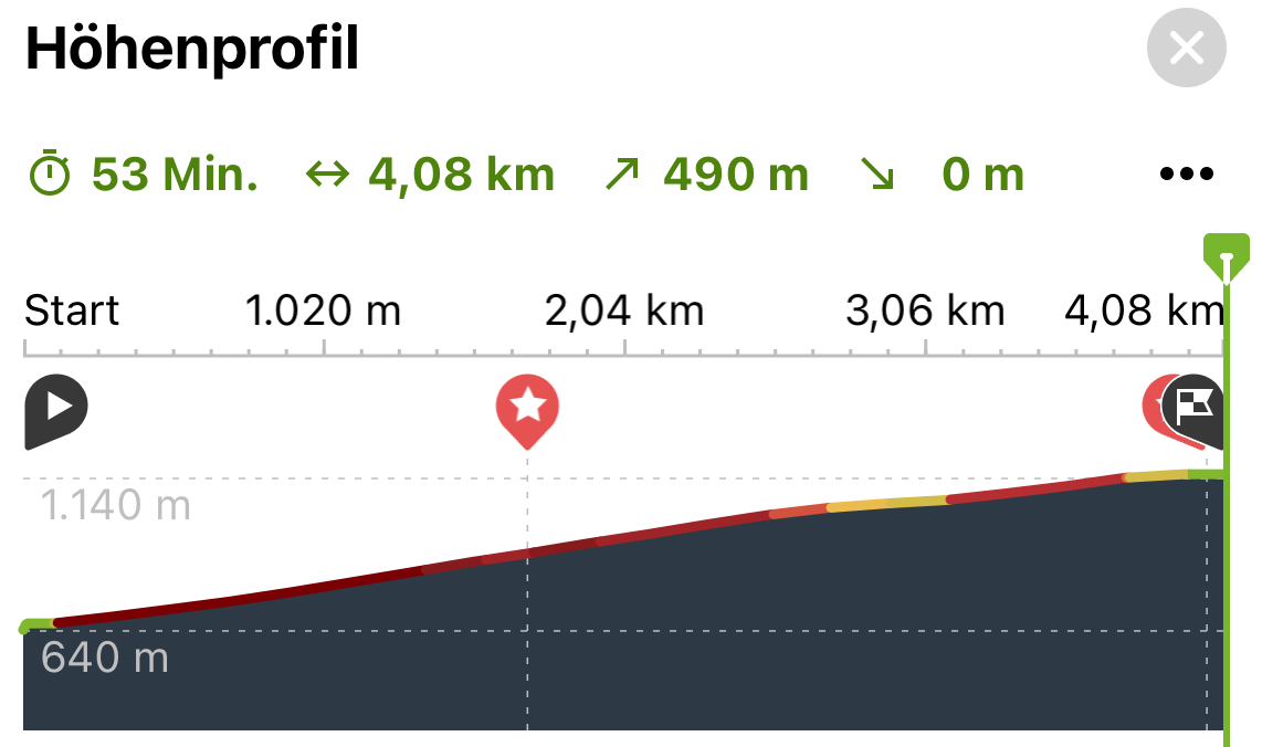 Soweit meine Gefühle und Wahrnehmungen auf dieser Strecke. Ich habe vor Jahren vermutlich bis zu 3 Anläufe gebraucht, um erstmals ohne Abzusteigen hinaufzufahren - auch mit Hilfe von Zickzack- Schlangenlinien. Etwas Streckenkenntnis hilft ungemein. Viel Erfolg.