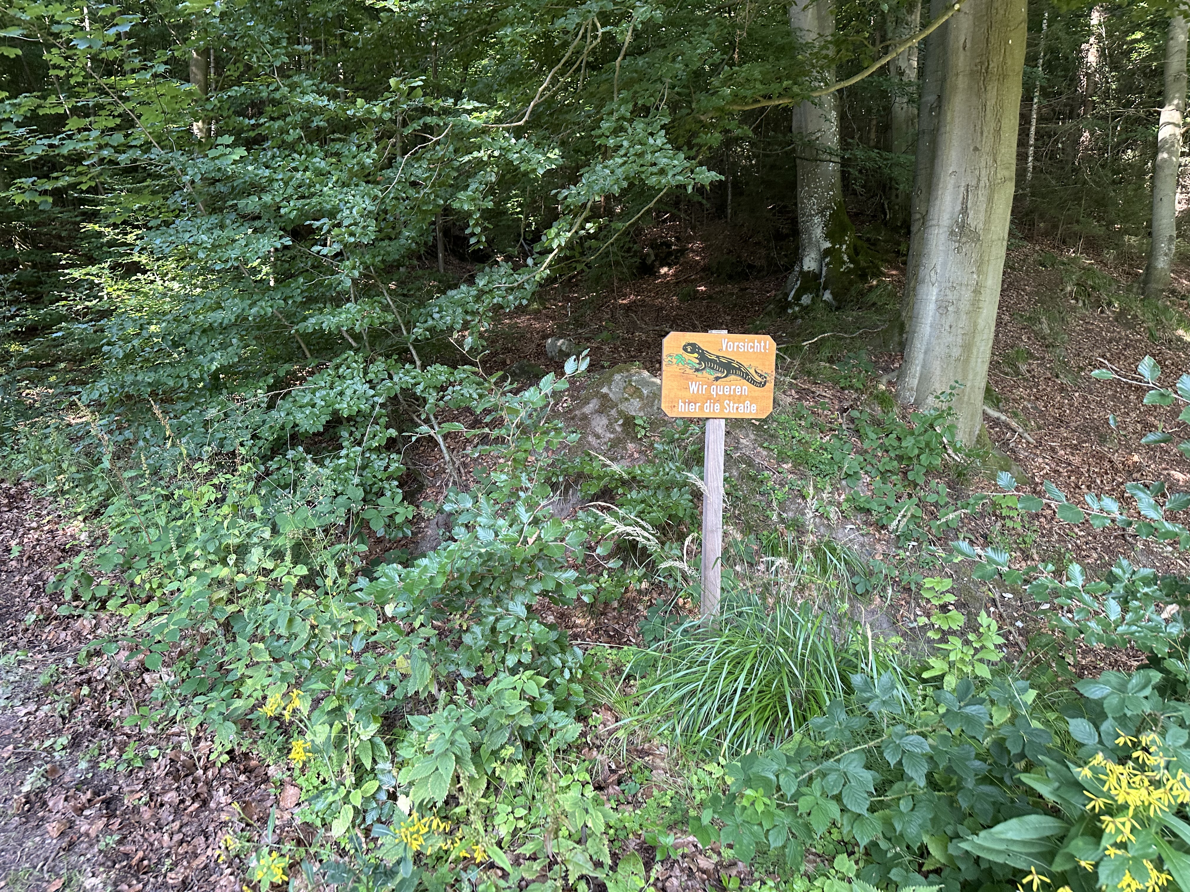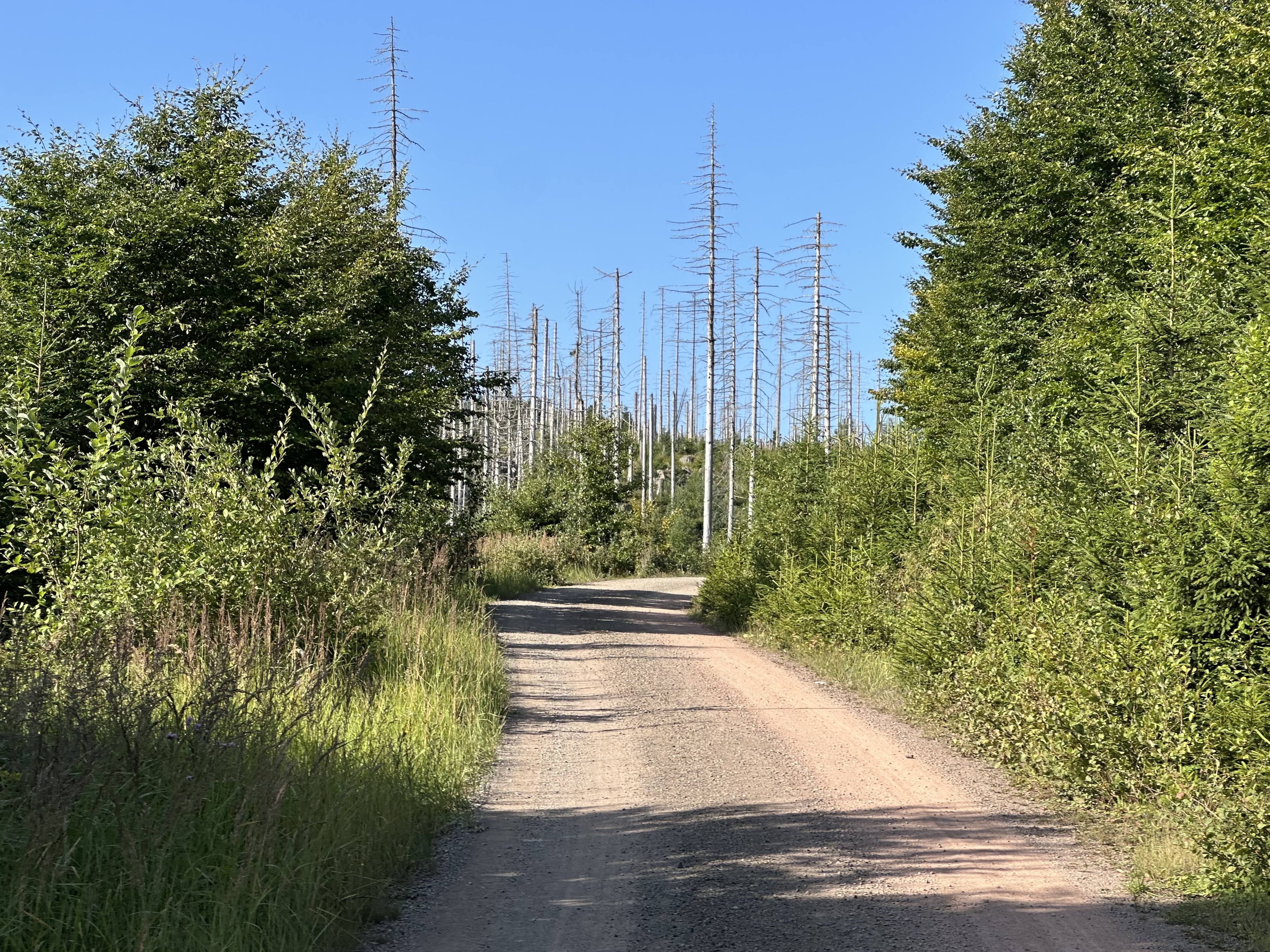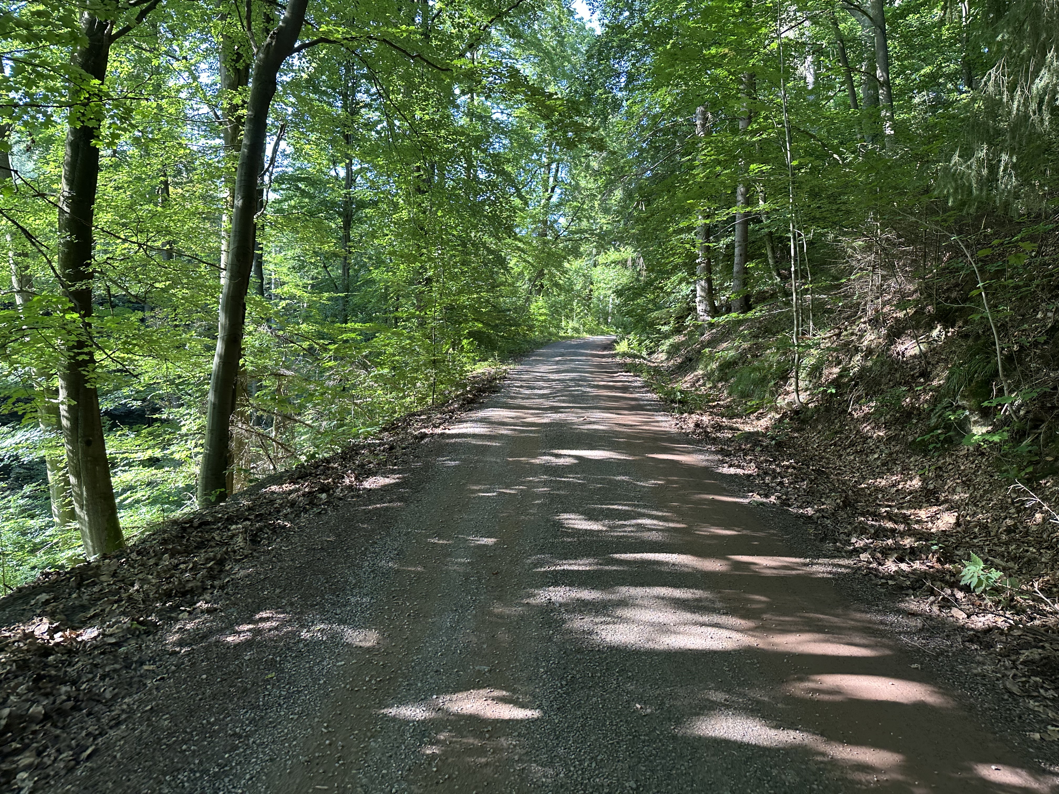 Außerhalb vom schattenspendenden Bäume war es schon recht heiß. Man könnte noch früher starten, aber ein bisschen Rücksicht auf größere Tiere ist auch mal angebracht, die machen abends bis morgens ihre „Stellungswechsel“. Danach kommen die Menschen wieder, auf Fahrrädern, auf mehr oder minder geeigneten Wanderschuhen, auf Motorrädern und vieles mehr. Da schon muss sich großes Waldviehzeug versteckt halten.