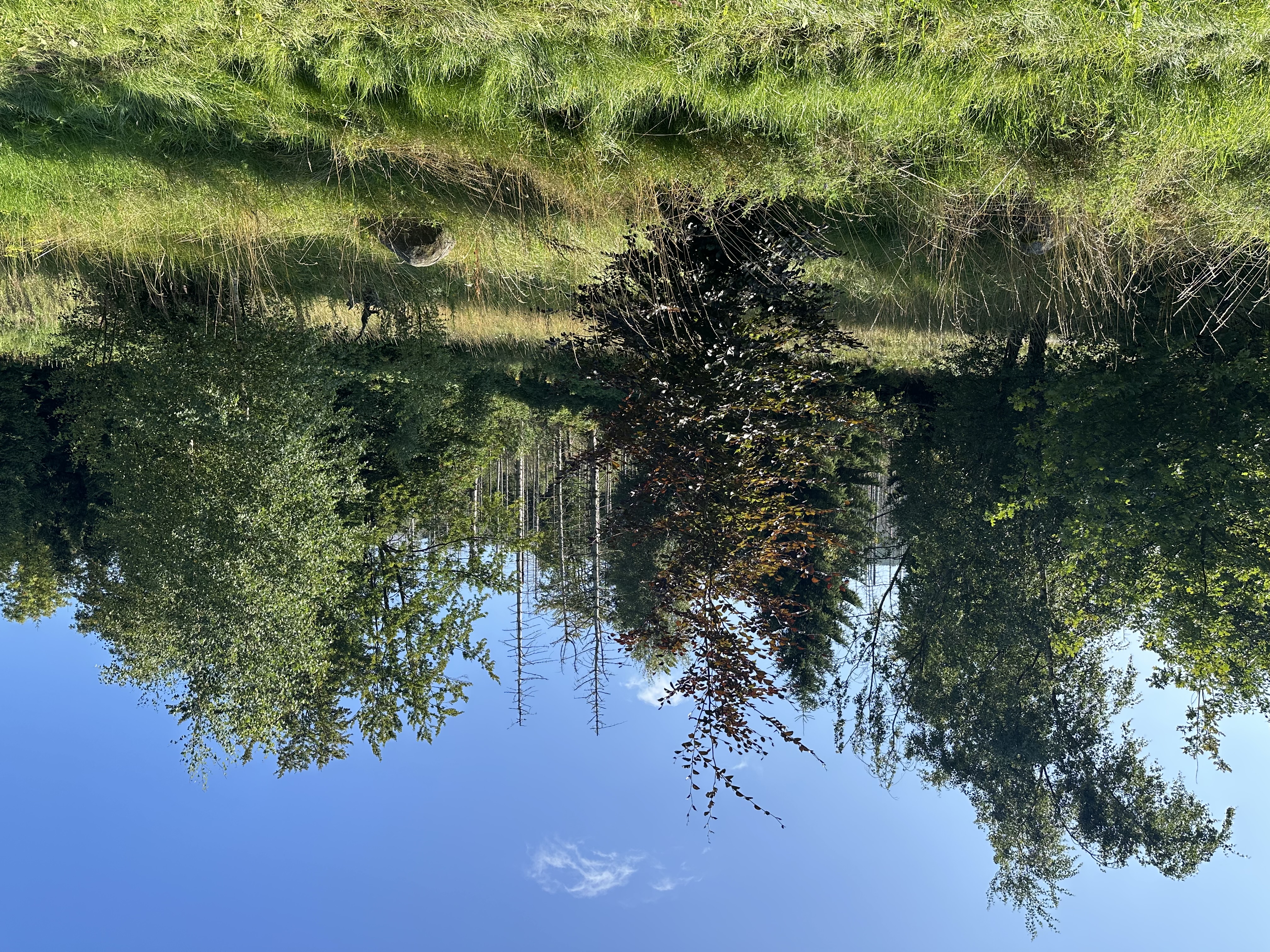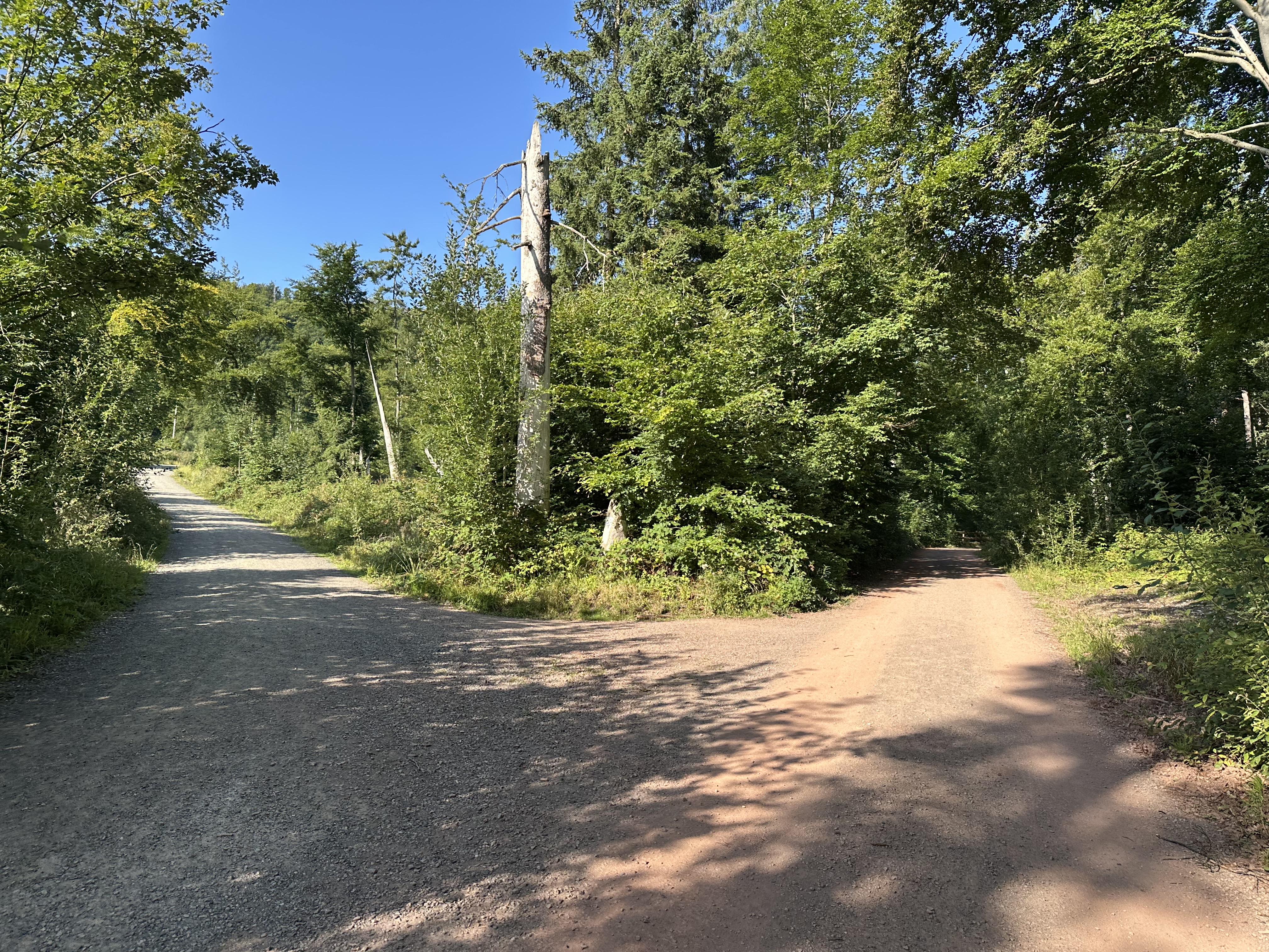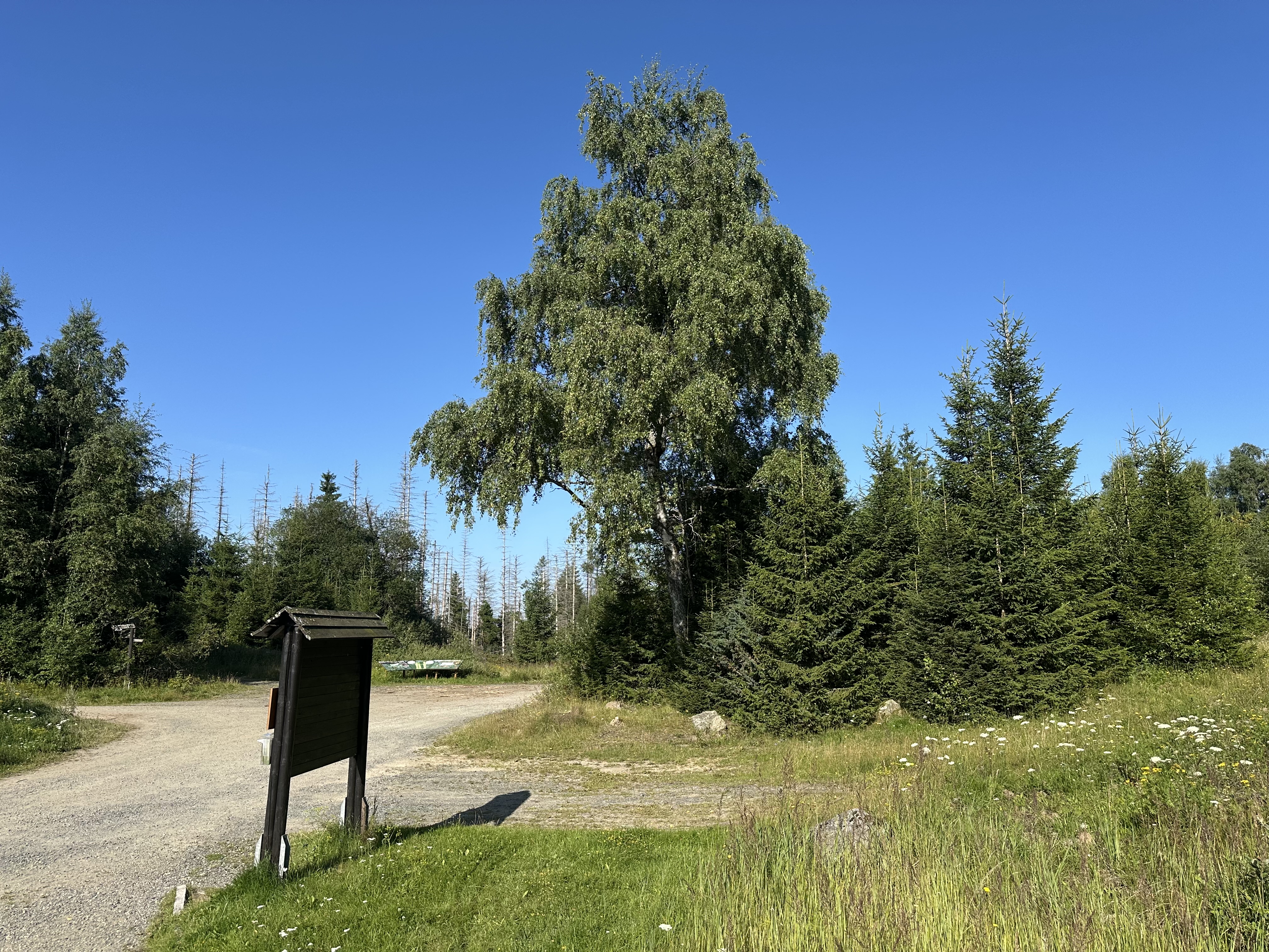Außerhalb vom schattenspendenden Bäume war es schon recht heiß. Man könnte noch früher starten, aber ein bisschen Rücksicht auf größere Tiere ist auch mal angebracht, die machen abends bis morgens ihre „Stellungswechsel“. Danach kommen die Menschen wieder, auf Fahrrädern, auf mehr oder minder geeigneten Wanderschuhen, auf Motorrädern und vieles mehr. Da schon muss sich großes Waldviehzeug versteckt halten.