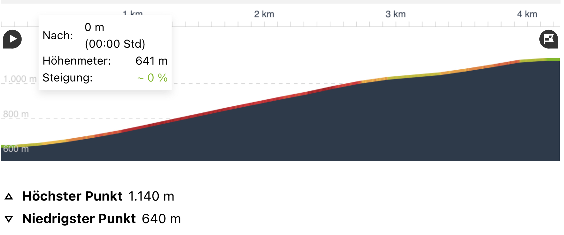 - Steigungsprozente gibt die App, überall wo rot mit >10% an. Max. sind 17% Steigung angegeben (ca. 2x).