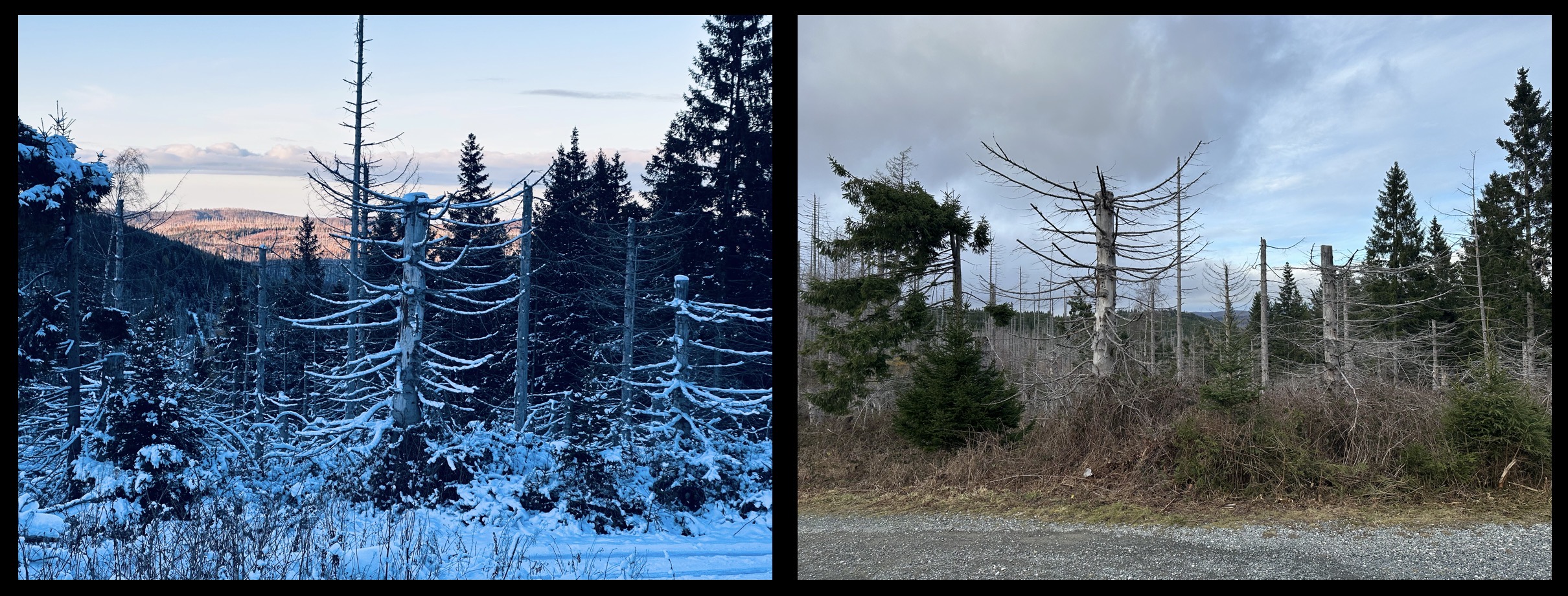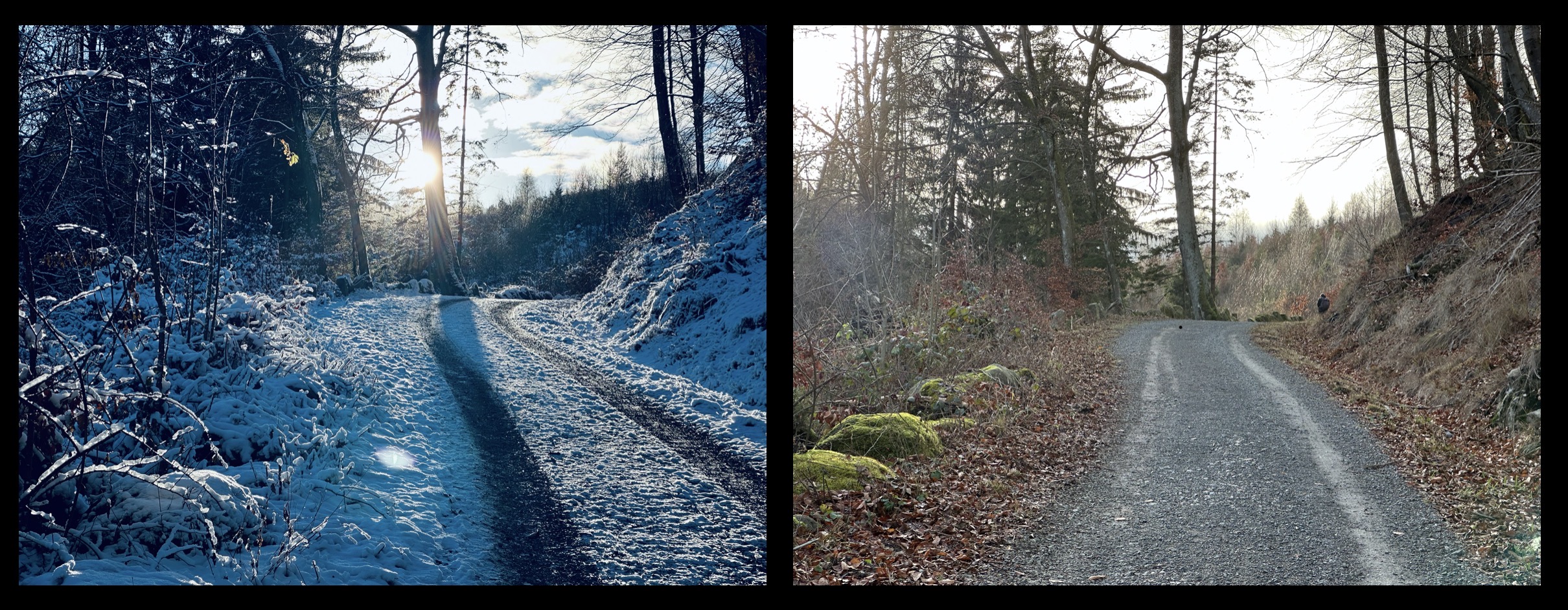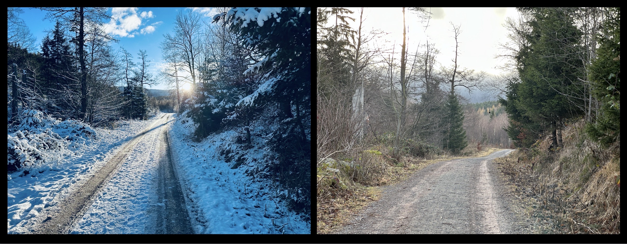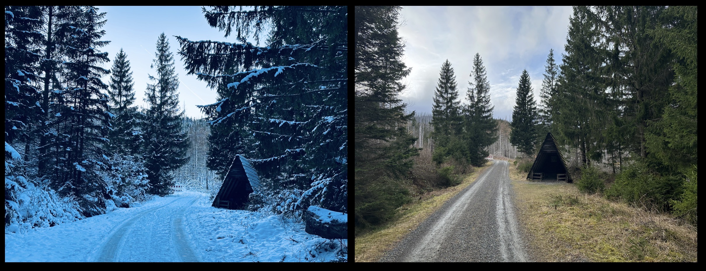 Diese Woche war der Schnee weitestgehend wieder weg und dann kommt auch hinauf. Ich habe letzte Woche ein paar Fotos gemacht, diese Woche an den gleichen Stelle wieder und das ganze zusammengefügt. Das sind schon zwei verschiedene Welten.