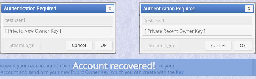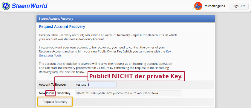 Der Recovery Account meldet sich bei Steemworld Account Recovery an und trägt dort den neuen public Owner Key ein.