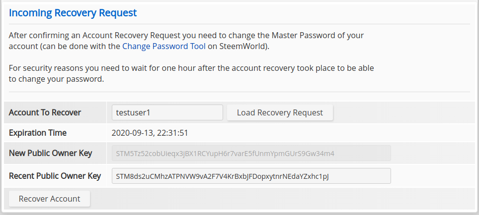 Dazu bei Steemworld Account Recovery unter "Incoming Recovery Request" den wiederherzustellenden Account eintragen, nach Klick auf "Load Recovery Request" wird die eingehende Anfrage angezeigt. 24 Stunden hat man Zeit, um diese zu bestätigen.